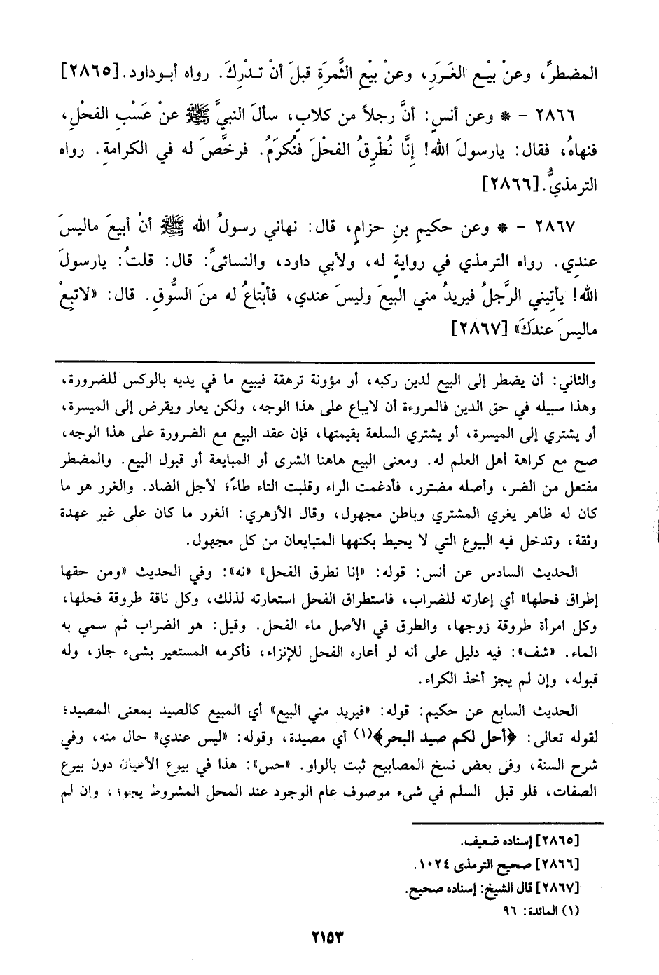 2867 - وعن حكيم بن حزام، قال: نهإني رسول الله صلى الله عليه وسلم أن أبيع ما ليس عندي. رواه الترمذي في رواية له، ولأبي داود، والنسائي: قال: قلت: يا رسول الله! يأتيني الرجل فيريد مني البيع وليس عندي، فأبتاع له من السوق. قال: ((لا تبع ما ليس عندك)). [2867]
