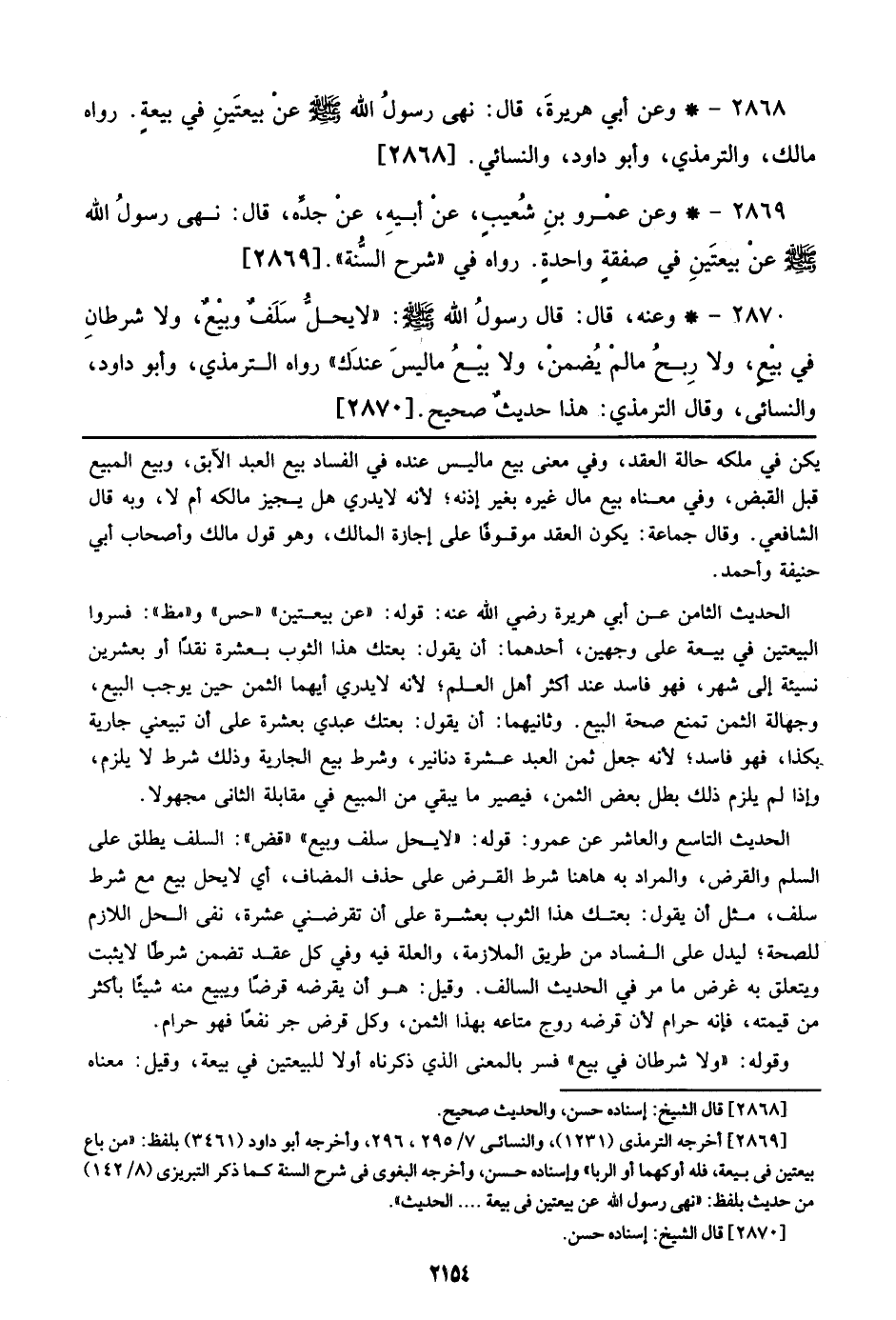 2868 - وعن أبي هريرة، قال: نهي رسول الله صلى الله عليه وسلم عن بيعتين في بيعة. رواه مالك، والترمذي، والنسائي. [2868]