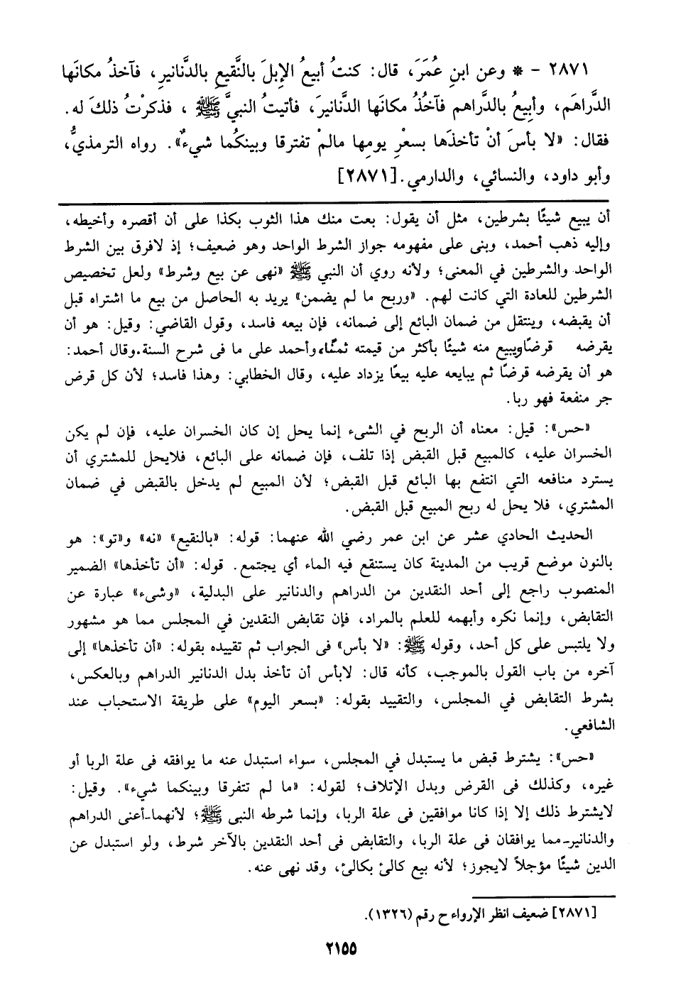 2871 - وعن ابن عمر، قال: كنت أبيع الإبل بالنقيع بالدنإنير، فآخذ مكانها الدراهم، وأبيع بالدراهم فآخذ مكانها الدنإنير، فأتيت النبي صلى الله عليه وسلم، فذكرت ذلك له. فقال: ((لا بأس أن تأخذها بسعر يومها ما لم تفترقا وبينكما شيء)). رواه الترمذي، وأبو داود، والنسائي، والدارمي. [2871]