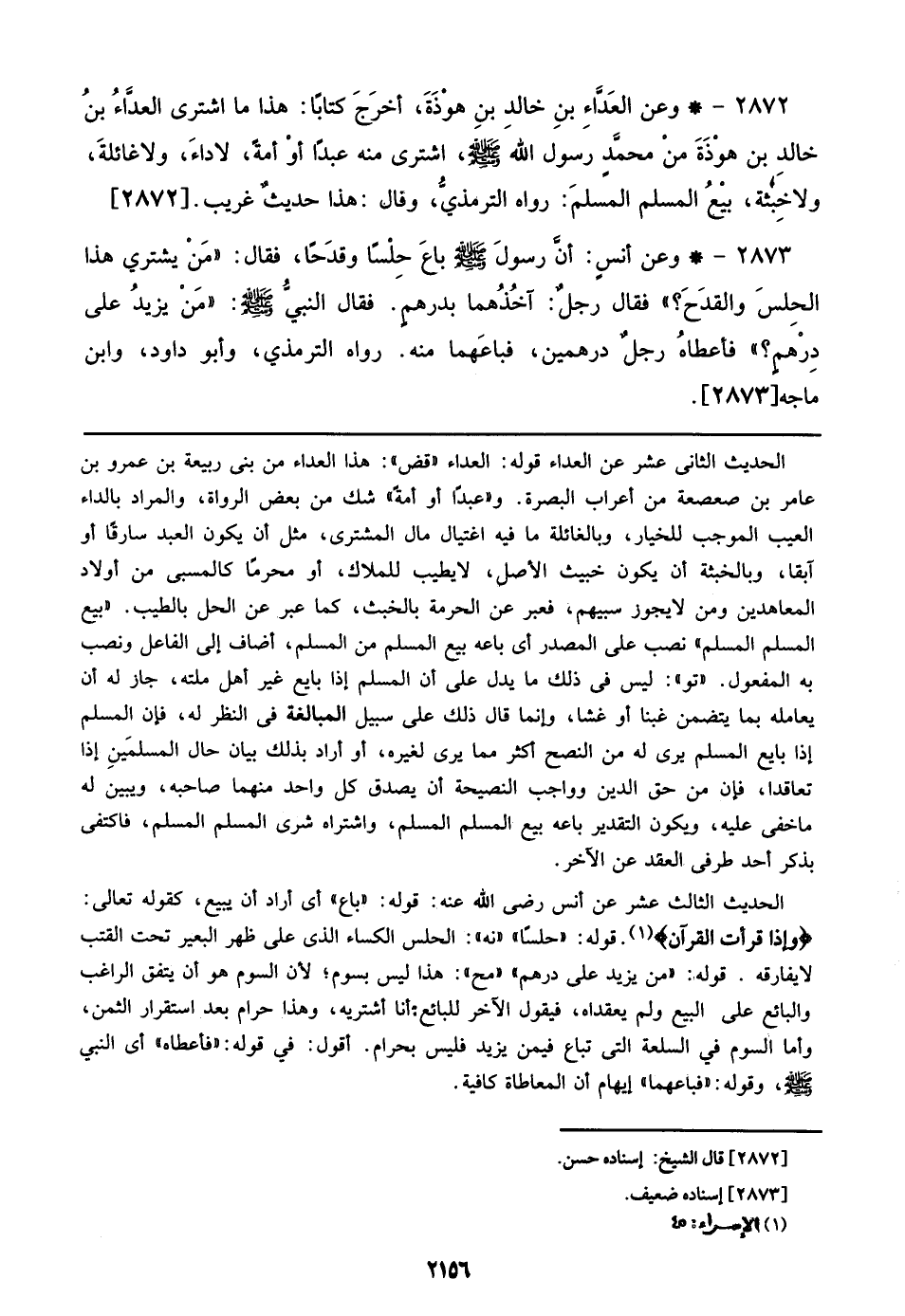 2872 - وعن العداء بن خالد بن هوذة، أخرج كتابا: هذا ما اشترى العداء بن خالد بن هوذة من محمد رسول الله صلى الله عليه وسلم، اشترى منه عبدا أو أمة، لا داء، ولا غائلة، ولا خبثة، بيع المسلم المسلم. رواه الترمذي، وقال: هذا حديث غريب. [2872]