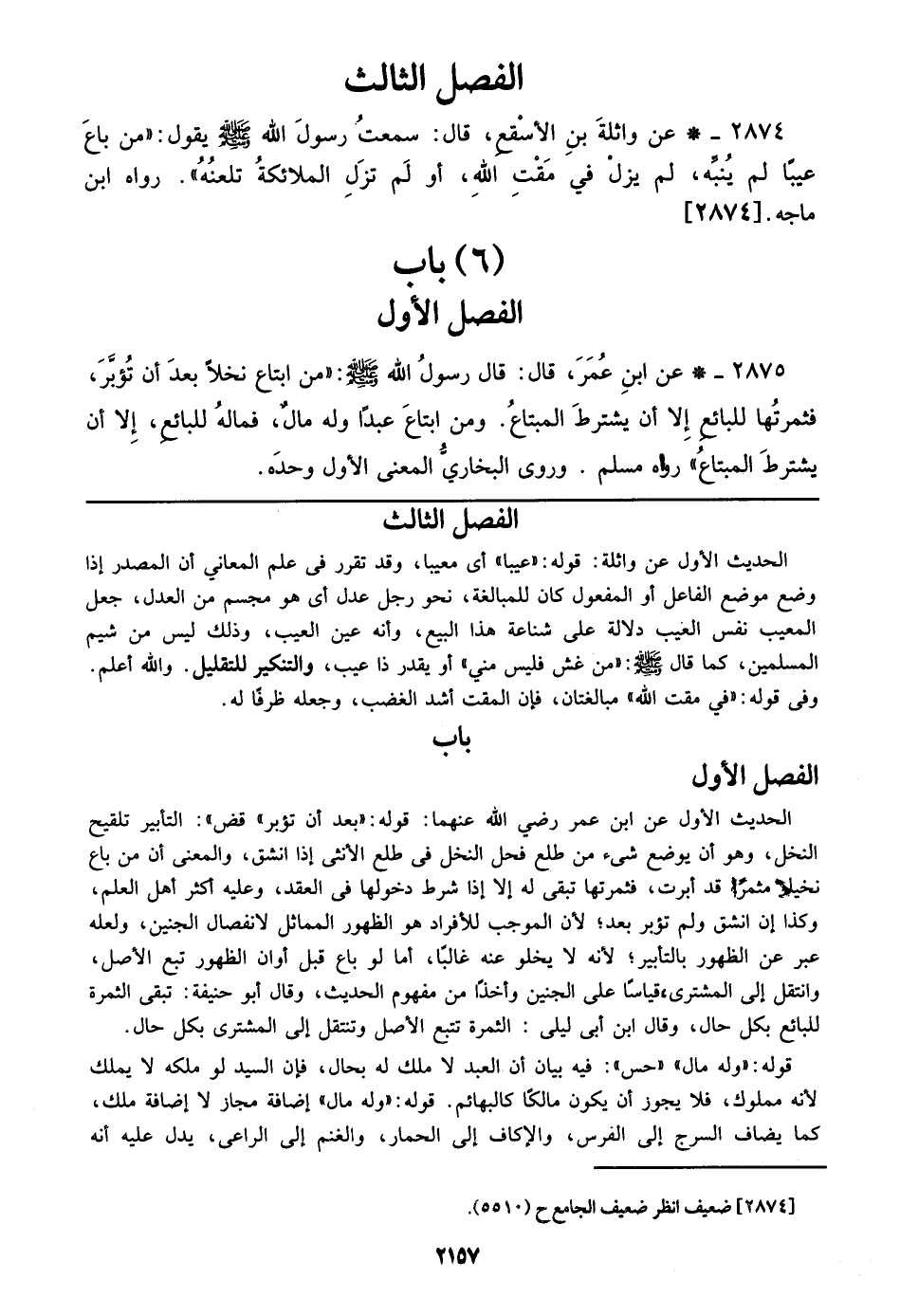 2875 - عن ابن عمر، قال: قال رسول الله صلى الله عليه وسلم: ((من ابتاع نخلا بعد أن تؤبر، فثمرتها للبائع إلا أن يشترط المبتاع. ومن ابتاع عبدا وله مال، فماله للبائع، إلا أن يشترط المبتاع)). رواه مسلم. وروى