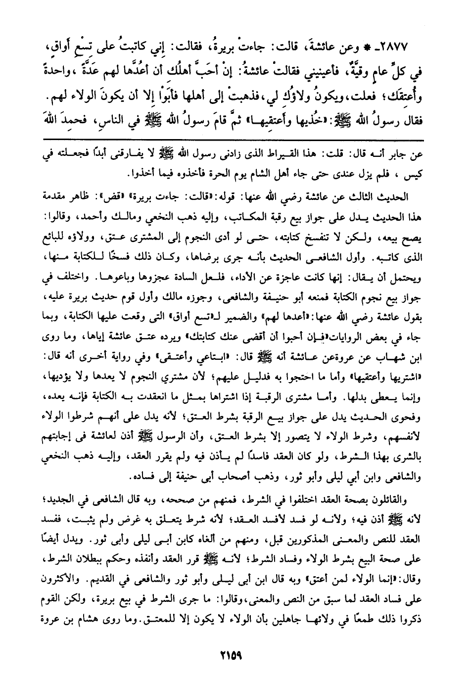 الحديث الثالث عن عائشة رضي الله عنها: قوله: ((قالت: جاءت بريرة)) ((قض)): ظاهر مقدمة هذا الحديث يدل علي جواز بيع رقبة المكاتب، وإليه ذهب النخعي ومالك وأحمد، وقالوا: يصح بيعه، ولكن لا تنفسخ كتابته، حتى لو أدى النجوم إلي المشتري عتق، وولاؤه للبائع الذي كاتبه. وأول الشافعي الحديث بأنه جرى برضاها، وكان ذلك فسخاً للكتابة منها، ويحتمل أن يقال: إنها كانت عاجزة عن الأداء، فلعل السادة عجزوها وباعوها. واختلف في جواز بيع نجوم الكتابة فمنعه أبو حنيفة والشافعي، وجوزه مالك وأول قوم حديث بريرة عليه، بقول عائشة رضي الله عنها: ((أعدها لهم)) والضمير لـ ((تسع أواق)) التي وقعت عليها الكتابة، وبما جاء في بعض الروايات ((فإن أحبوا أن أقضي عنك كتابتك)) ويرده عتق عائشة إياها، وما روى ابن شهاب عن عروة عن عائشة أنه صلى الله عليه وسلم قال: ((ابتاعي وأعتقي)) وفي رواية أخرى أنه قال: ((اشتريها وأعتقيها)) وأما ما احتجوا به فدليل عليهم؛ لأن مشتري النجوم لا يعدها ولا يؤديها، وإنما يعطى بدلها. وأما مشتري الرقبة إذا اشتراها بمثل ما انعقدت به الكتابة فإنه يعده، وفحوى الحديث يدل علي جواز بيع الرقبة بشرط العتق؛ لأنه يدل علي أنهم شرطوا الولاء لأنفسهم، وشرط الولاء لا يتصور إلا بشرط العتق، وأن النبي صلي الله عليه وسلن أذن لعائشة في إجابتهم بالشرى بهذا الشرط، ولو كان العقد فاسداً لم يأذن فيه ولم يقرر العقد، وإليه ذهب النخعي والشافعي وابن أبي ليلي وأبو ثور، وذهب أصحاب أبي حنيفة إلي فساده.