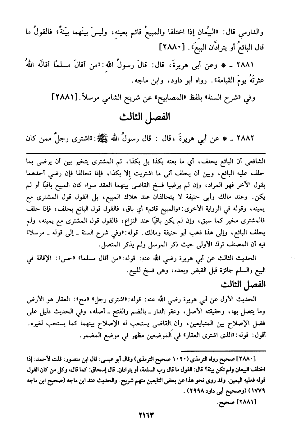 الحديث الأول عن أبي هريرة رضي الله عنه: قوله: ((اشترى رجل)) ((مح)): العقار هو الأرض وما يتصل بها، وحقيقته الأصل، وعقر الدار- بالضم والفتح- أصله، وفي الحديث دليل علي فضل الإصلاح بين المتبايعين، وأن القاضي يستحب له الإصلاح بينهما كما يستحب لغيره. أقول: قوله: ((الذي اشترى العقار)) في الموضعين مظهر في موضع المضمر.
