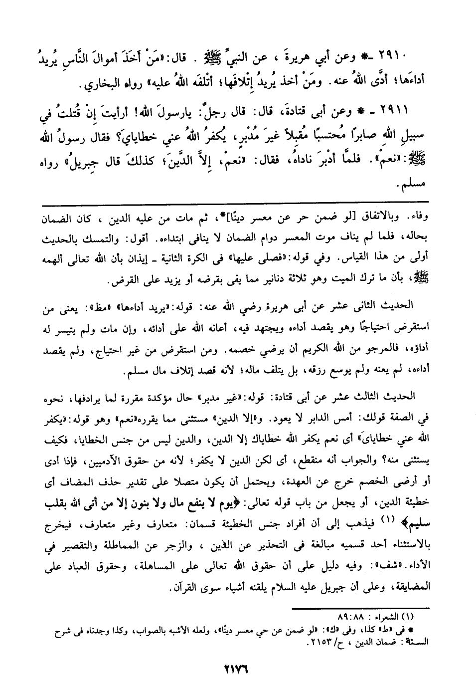 2911 - وعن أبي قتادة، قال: قال رجل: يا رسول الله! أرأيت إن قتلت في سبيل الله صابرا محتسبا مقبلا غير مدبر، يكفر الله عني خطاياي؟ فقال رسول الله صلى الله عليه وسلم: ((نعم)). فلما أدبر ناداه، فقال: ((نعم، إلا الدين؛ كذلك قال جبريل)). رواه مسلم.