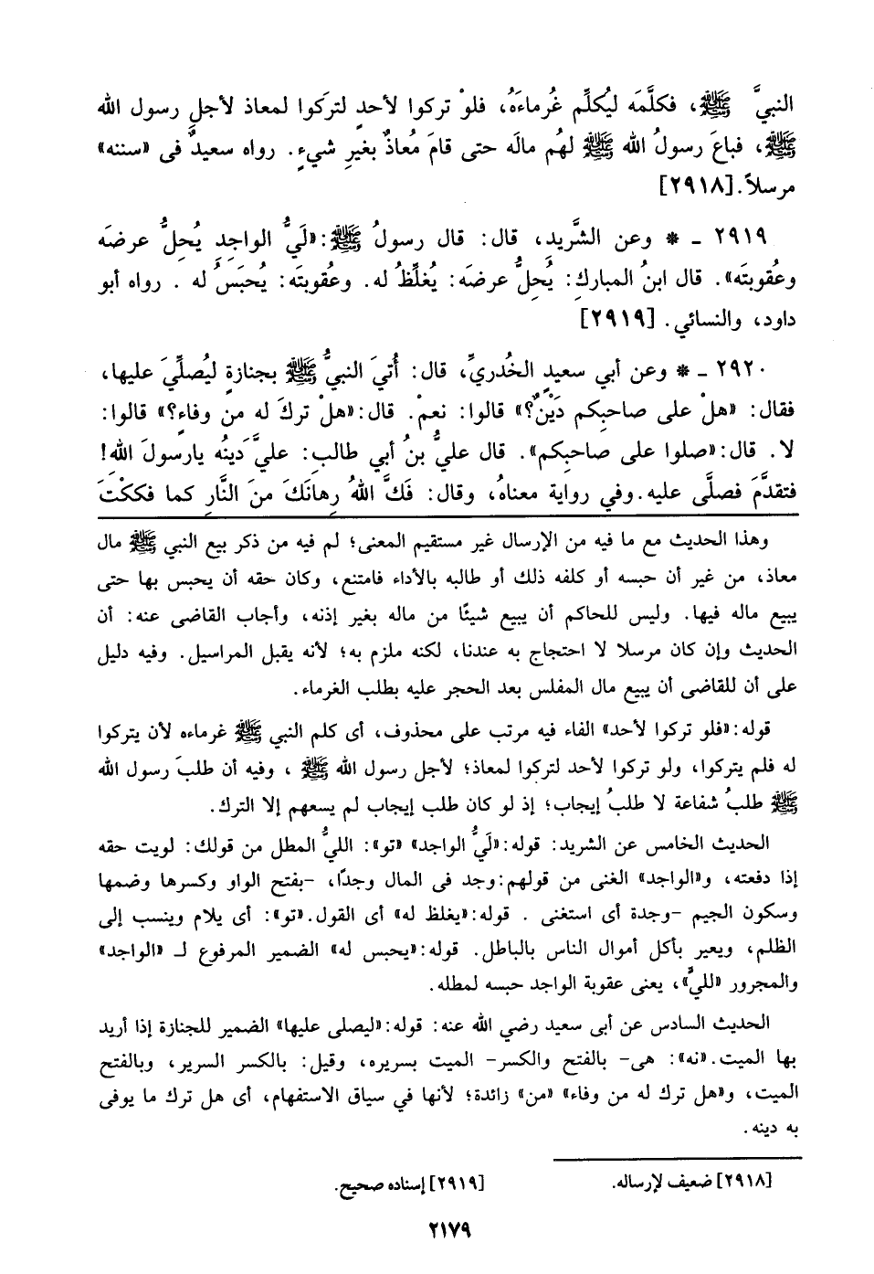 الحديث السادس عن أبي سعيد رضي الله عنه: قوله: ((ليصلي عليها)) الضمير للجنازة إذا أريد بها الميت. ((نه)): هي – بالفتح والكسر- الميت بسريره، وقيل: بالكسر السرير، وبالفتح الميت، و ((هل ترك له من وفاء)) ((من)) زائدة؛ لأنها في سياق الاستفهام، أي هل ترك ما يوفي به دينه ..