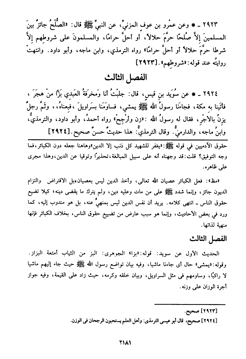 2923 - وعن عمرو بن عوف المزني، عن النبي صلى الله عليه وسلم قال: ((الصلح جائز بين المسلمين إلا صلحاً حرم حلالاً، أو أحل حراماً، والمسلمون علي شروطهم إلا شرطاً حرم حلالاً أو أحل حراماً)) رواه الترمذي،