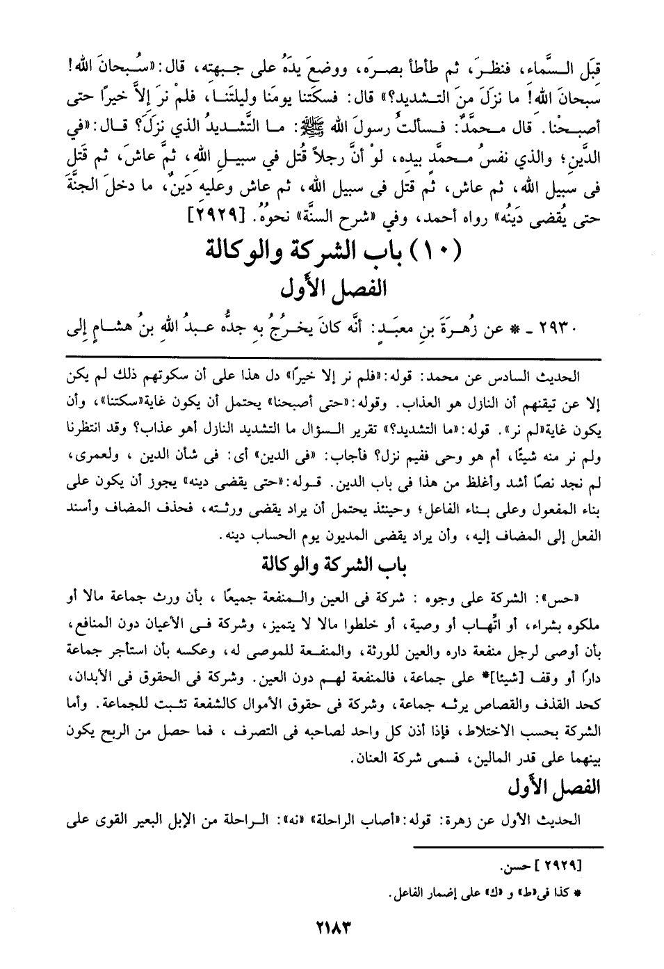 الحديث السادس عن محمد: قوله: ((فلم نر إلا خيراً)) دل هذا علي أن سكوتهم ذلك لم يكن إلا عن تيقنهم أن النازل هو العذاب. وقوله: ((حتى أصبحنا)) يحتمل أن يكون غاية ((سكتنا))، وأن يكون غاية ((لم نر)). قوله: ((ما التشديد؟)) تقرير السؤال ما التشديد النازل أهو عذاب؟ وقد انتظرنا ولم نر شيئاً، أم هو وحي ففيم نزل؟ فأجاب: ((في الدين)) أي: في شأن الدين، ولعمري، لم نجد نصاً أشد وأغلظ من هذا في باب الدين. قوله: ((حتى يقضي دينه)) يجوز أن يكون علي بناء المفعول وعلي بناء الفاعل؛ وحينئذ يحتمل أن يراد يقضي ورثته، فحذف المضاف وأسند الفعل إلي المضاف إليه، وأن المراد يقضي المديون يوم الحساب دينه.