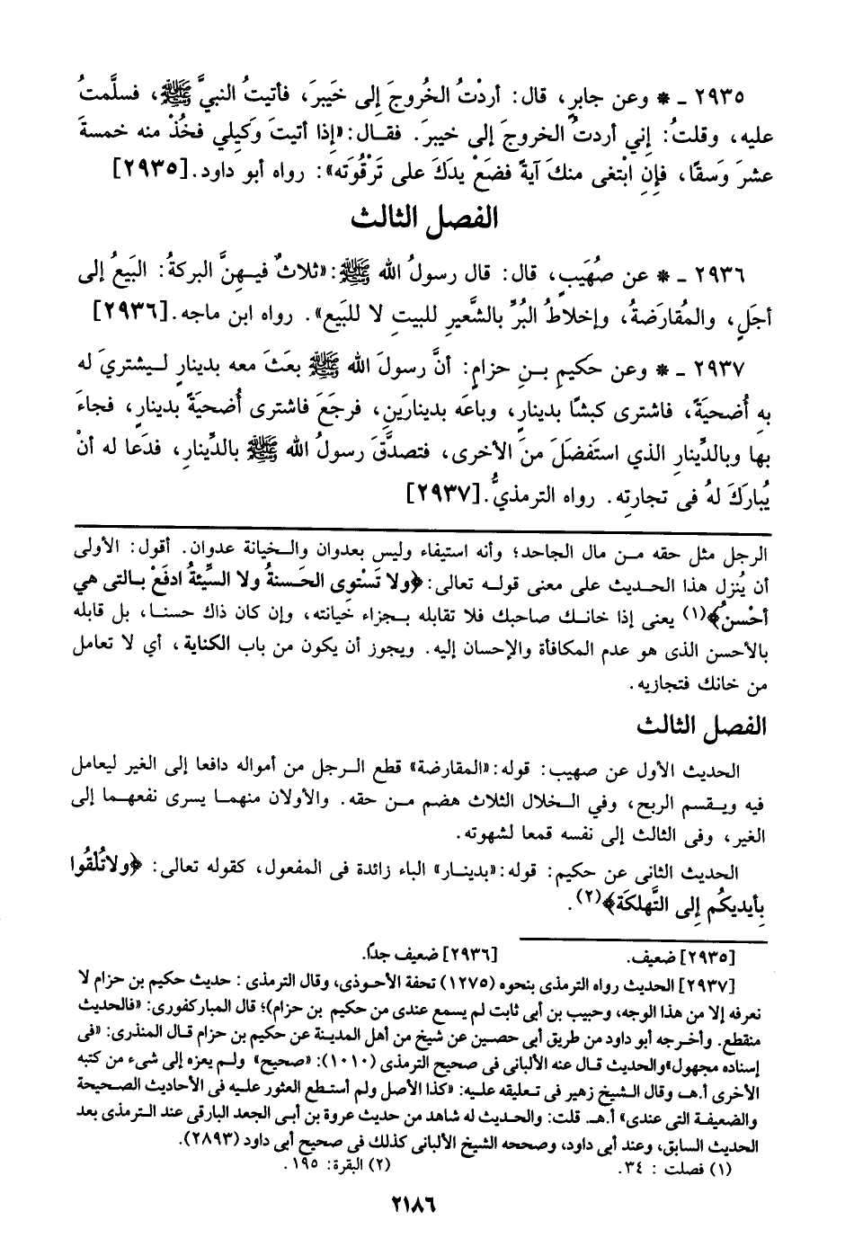 الحديث الأول عن صهيب: قوله: ((المقارضة)) قطع الرجل من أمواله دافعاً إلي الغير ليعامل فيه ويقسم الربح، وفي الخلال الثلاث هضم من حقه. والأولان منهما يسري نفعهما إلي الغير، وفي الثالث إلي نفسه قمعاً لشهوته.