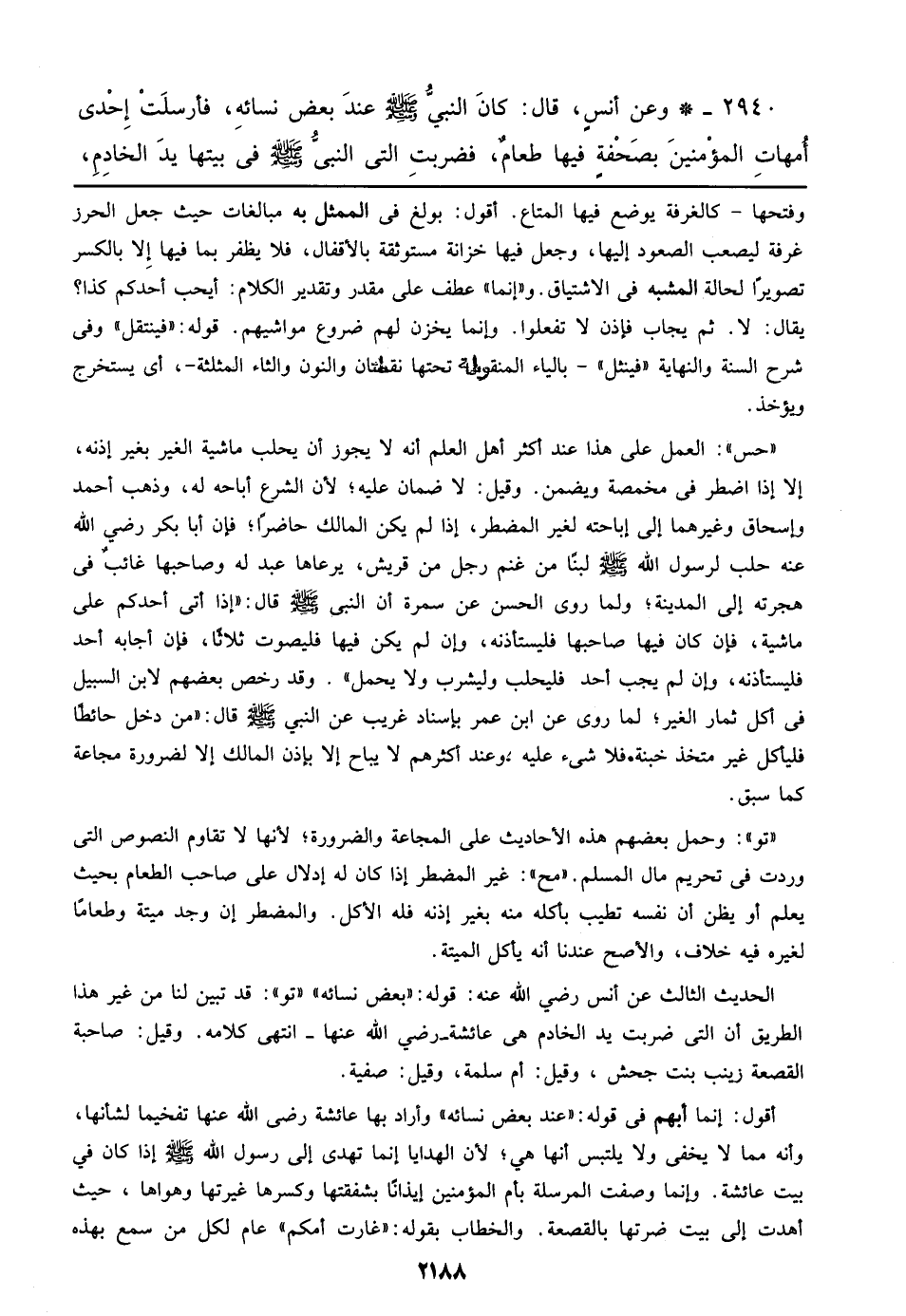 2940 - وعن أنس، قال: كان النبي صلى الله عليه وسلم عند بعض نسائه، فأرسلت إحدى أمهات المؤمنين بصحفة فيها طعام، فضربت التي النبي صلى الله عليه وسلم في بيتها يد الخادم،