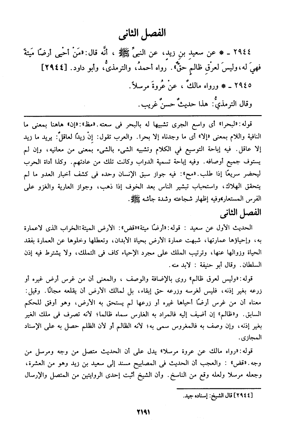 2944 - عن سعيد بن زيد، عن النبي صلى الله عليه وسلم، أنه قال: ((من أحيى أرضاً ميتةً فهي له، وليس لعرق ظالم حق)). رواه أحمد، والترمذي، وأبو داود. [2944]