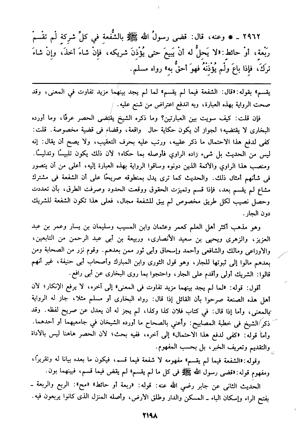 فإن قلت كيف سويت بين العبارتين؟ وما ذكره الشيخ يقتضي الحصر عرفاً، وما أورده البخاري لا يقتضيه؛ لجواز أن يكون حكاية حال واقعة، وقضاء في قضية مخصوصة. قلت: كفي لدفع هذا الاحتمال ما ذكر عقيبه، ورتب عليه بحرف التعقيب، ولا يصح أن يقال: إنه ليس من الحديث بل شيء زاده الراوي فأوصله بما حكاه؛ لأن ذلك يكون تلبيساً وتدليساً. ومنصب هذا الراوي والأئمة الذين دنوه وساقوا الرواية بهذه العبارة إليه، أعلي من أن يتصور في شأنهم أمثال ذلك. والحديث كما ترى يدل بمنطوقه صريحاً علي أن الشفعة في مشترك مشاع لم يقسم بعد، فإذا قسم وتميزت الحقوق ووقعت الحدود وصرفت الطرق، بأن تعددت وحصل نصيب لكل طريق مخصوص لم يبق للشفعة مجال، فعلي هذا تكون الشفعة للشريك دون الجار.