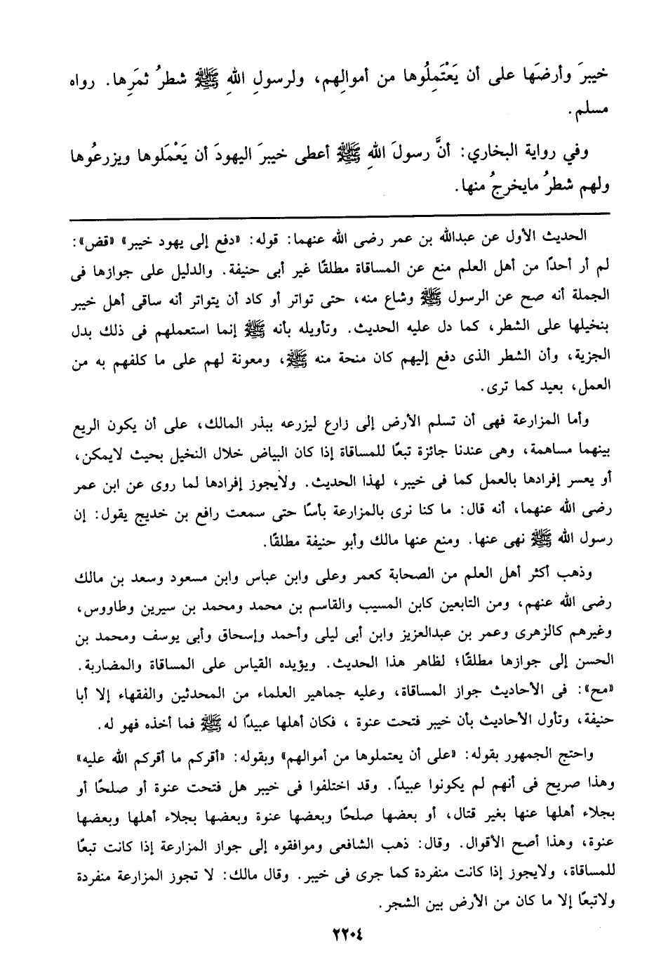 الحديث الأول عن عبد الله بن عمر رضي الله عنهما: قوله: ((دفع إلي يهود خيبر)) ((قض)): لم أر أحداً من أهل العلم منع عن المساقاة مطلقاً غير أبي حنيفة. والدليل علي جوازها في الجملة أنه صح عن الرسول صلى الله عليه وسلم وشاع منه، حتى تواتر أو كاد أن يتواتر أنه ساقى أهل خيبر بنخليها علي الشطر، كما دل عليه الحديث. وتأويله بأنه صلى الله عليه وسلم إنما استعملهم في ذلك بدل الجزية، وأن الشطر الذي دفع إليهم كان منحة منه صلى الله عليه وسلم، ومعونة لهم علي ما كلفهم به من العمل، بعيد كما ترى.