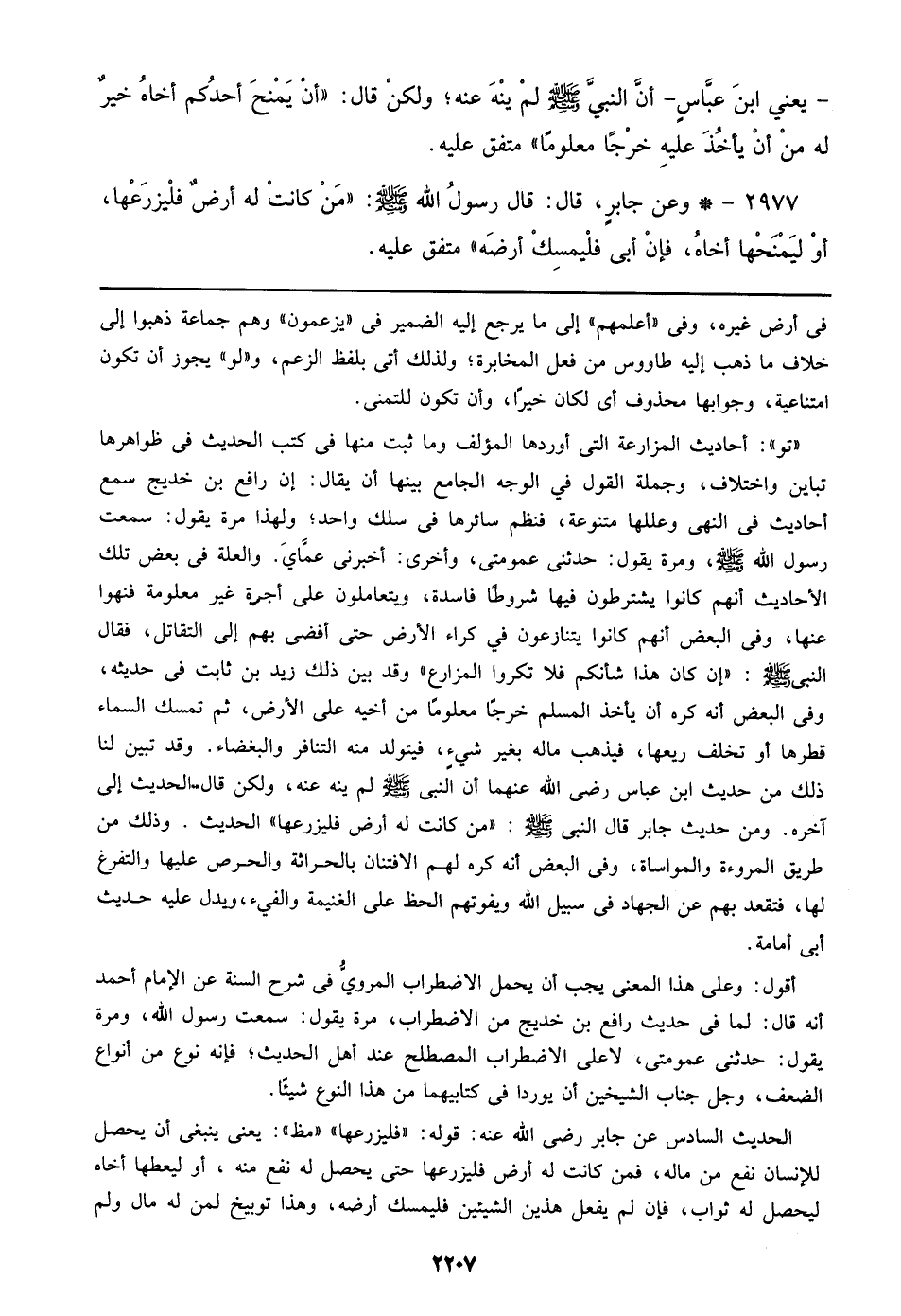 ((تو)): أحاديث المزارعة التي أوردها المؤلف وما ثبت منها في كتب الحديث في ظواهرها تباين واختلاف، وجملة القول في الوجه الجامع بينها أن يقال: إن رافع بن خديج سمع أحاديث في النهي وعللها متنوعة، فنظم سائرها في سلك واحد؛ ولهذا مرة يقول: سمعت رسول الله صلى الله عليه وسلم، ومرة يقول: حدثني عمومتي، وأخرى: أخبرني عماي. والعلة في بعض تلك الأحاديث أنهم كانوا يشترطون فيها شروطاً فاسدة، ويتعاملون علي أجرة غير معلومة فنهوا عنها، وفي البعض أنهم كانوا يتنازعون في كراء الأرض حتى أفضى بهم إلي التقاتل، فقال النبي صلى الله عليه وسلم: ((إن كان هذا شأنكم فلا تكروا المزارع)) وقد بين ذلك زيد بن ثابت في حديثه، وفي البعض أنه كره أن يأخذ المسلم خرجاً معلوماً من أخيه علي الأرض، ثم تمسك السماء قطرها أو تخلف ريعها، فيذهب ماله بغير شيء، فيتولد منه التنافر والبغضاء. وقد تبين لنا ذلك من حديث ابن عباس رضي الله عنهما أن النبي صلى الله عليه وسلم لم ينه عنه، ولكن قال .. الحديث إلي آخره. ومن حديث جابر قال النبي صلى الله عليه وسلم: ((من كانت له أرض فليزرعها)) الحديث. وذلك من طريق المروءة والمواساة، وفي البعض أنه كره لهم الافتنان بالحراثة والحرص عليها والتفرغ لها، فتقعد بهم عن الجهاد في سبيل الله ويفوتهم الحظ علي الغنيمة والفيء، ويدل عليه حديث أبي أمامة.