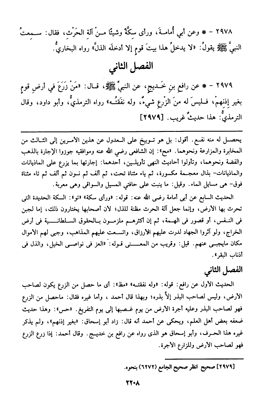 2978 - وعن أبي أمامة، ورأي سكة وشيئاً من آلة الحرث، فقال: سمعت النبي صلى الله عليه وسلم يقول: ((لا يدخل هذا بيت قوم إلا أدخله الذل)) رواه البخاري.