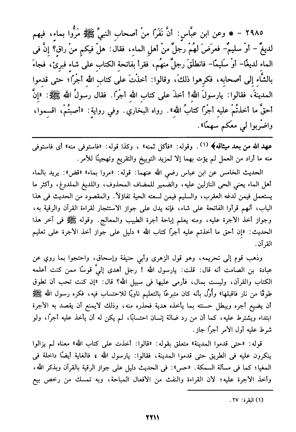 2985 - وعن ابن عباس: أن نفراً من أصحاب النبي صلى الله عليه وسلم مروا بماء، فيهم لديغ – أو سليم – فعرض لهم رجل من أهل الماء، فقال: هل فيكم من راق؟ إن في الماء لديغاً – أو سليماً – فانطلق رجل منهم، فقرأ بفاتحة الكتاب علي شاء فبرئ، فجاء بالشاء إلي أصحابه، فكرهوا ذلك، وقالوا: أخذت علي كتاب الله أجراً؛ حتى قدموا المدينة، فقالوا: يا رسول الله! أخذ علي كتاب الله أجراً. فقال رسول الله صلى الله عليه وسلم: ((إن أحق ما أخذتم عليه أجراً كتاب الله)). رواه البخاري. وفي رواية: ((أصبتم، اقسموا، واضربوا لي معكم سهماً)).