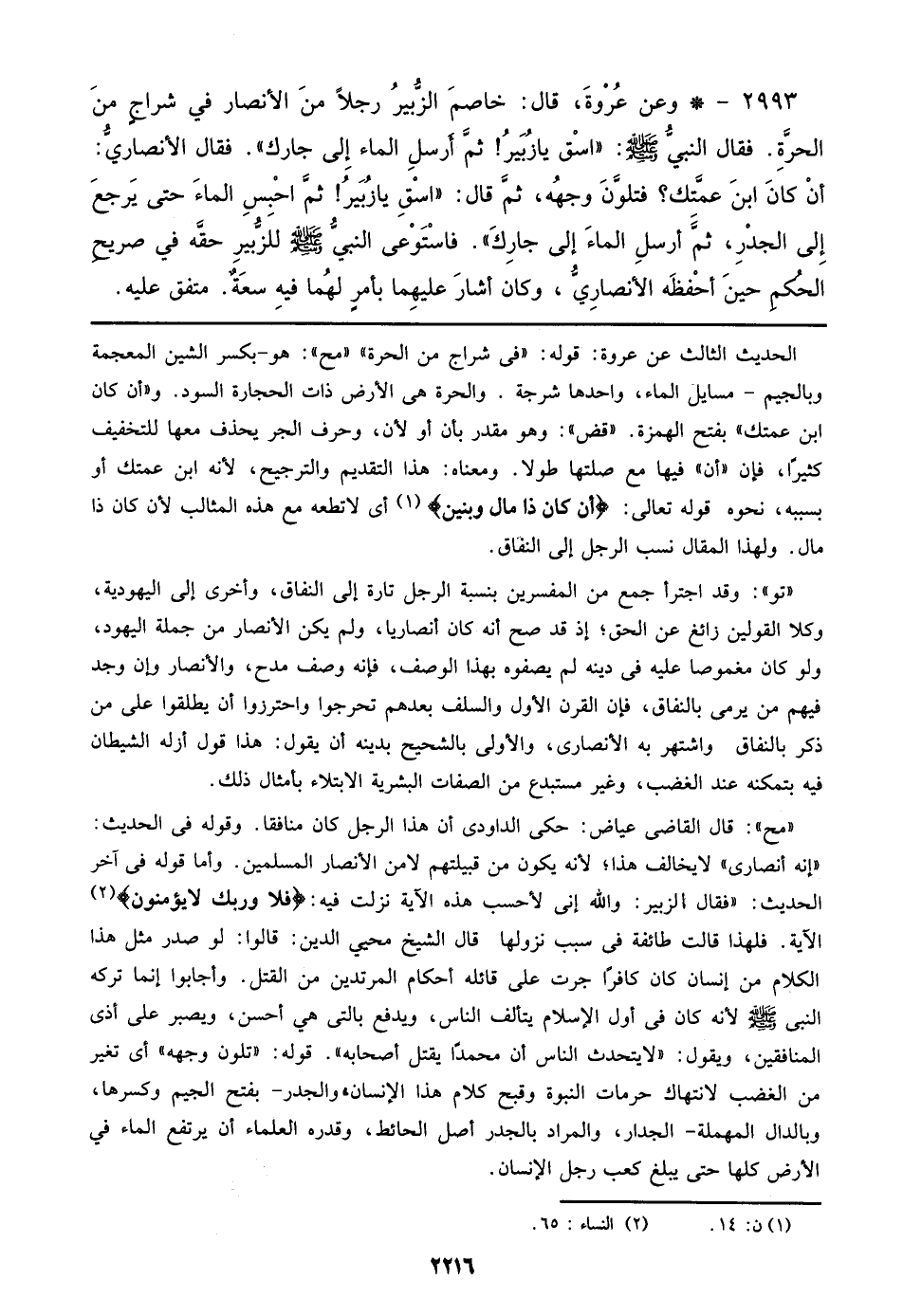 الحديث الثالث عن عروة: قوله: ((في شراج من الحرة)) ((مح)): هو – بكسر الشين المعجمة وبالجيم – مسايل الماء، واحدها شرجة. والحرة هي الأرض ذات الحجارة السود. و ((أن كان ابن عمتك)) بفتح الهمزة. ((قض)): وهو مقدر بأن أو لأن، وحرف الجر يحذف معها للتخفيف كثيراً، فإن ((أن)) فيها مع صلتها طولا. ومعناه: هذا التقديم والترجيح، لأنه ابن عمتك أو بسببه، نحوه قوله تعالي: {أَن كَانَ ذَا مَالٍ وبَنِينَ} أي لا تطعه مع هذه المثالب لأن كان ذا مال. ولهذا المقال نسب الرجل إلي النفاق.