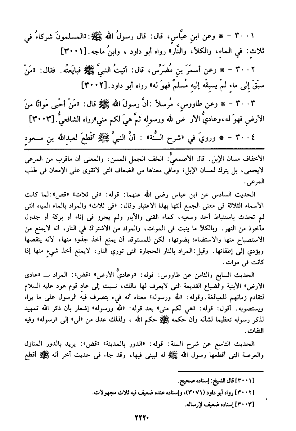 3001 - وعن ابن عباس، قال: قال رسول الله صلى الله عليه وسلم: ((المسلمون شركاء في ثلاث: في الماء، والكلأ، والنار)) رواه أبو داود، وابن ماجه. [3001]