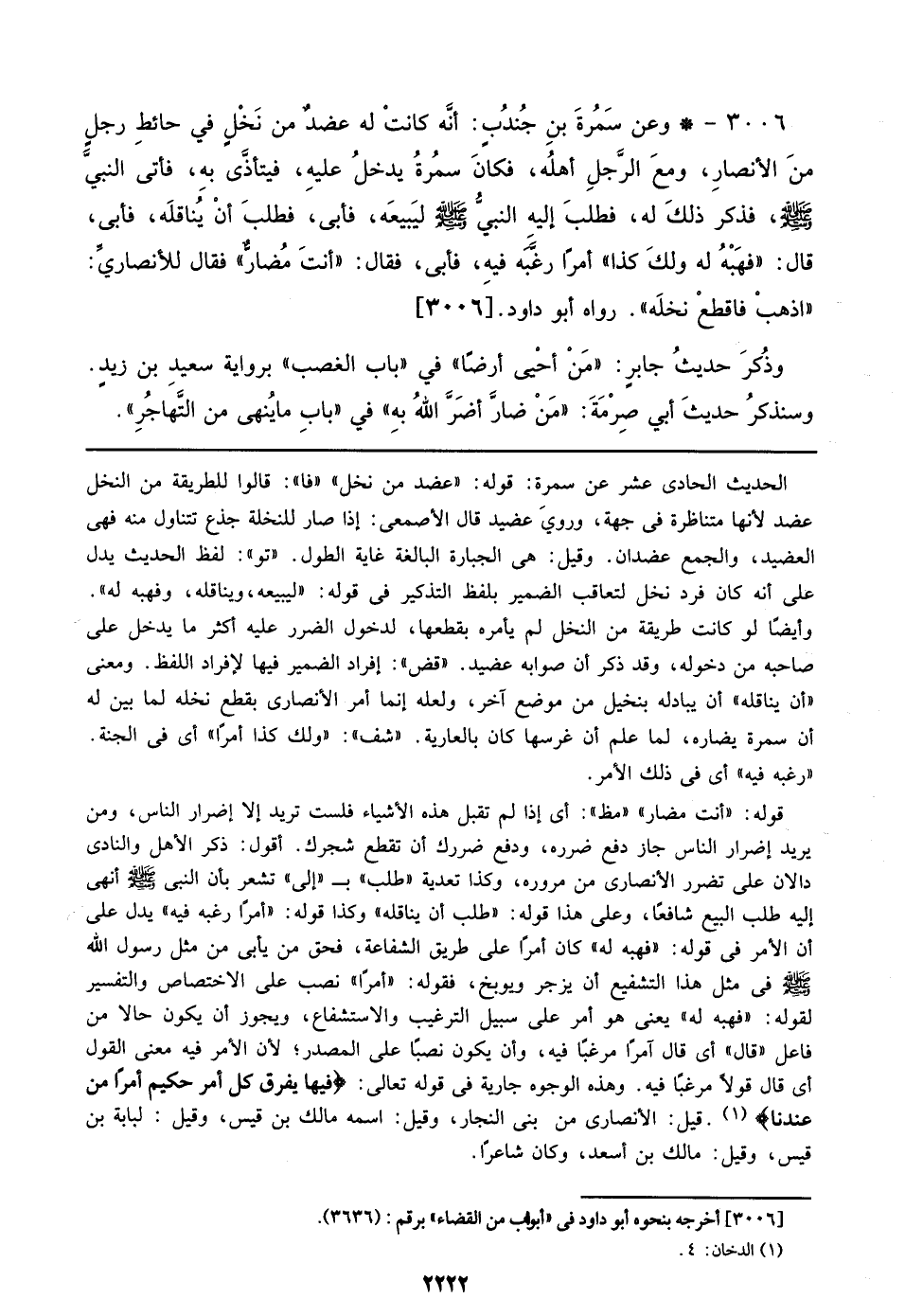 3006 - وعن سمرة بن جندب: أنه كانت له عضد من نخل في حائط رجل من الأنصار، ومع الرجل أهله، فكان سمرة يدخل عليه، فيتأذى به، فأتى النبي صلى الله عليه وسلم، فذكر ذلك له، فطلب إليه النبي صلى الله عليه وسلم ليبيعه، فأبي، فطلب أن يناقله، فأبي، قال: ((فهبه له ولك كذا)) أمراً رغبة فيه، فأبي، فقال: ((أنت مضار)) فقال للأنصاري: ((اذهب فاقطع نخله)). رواه أبو داود. [3006]