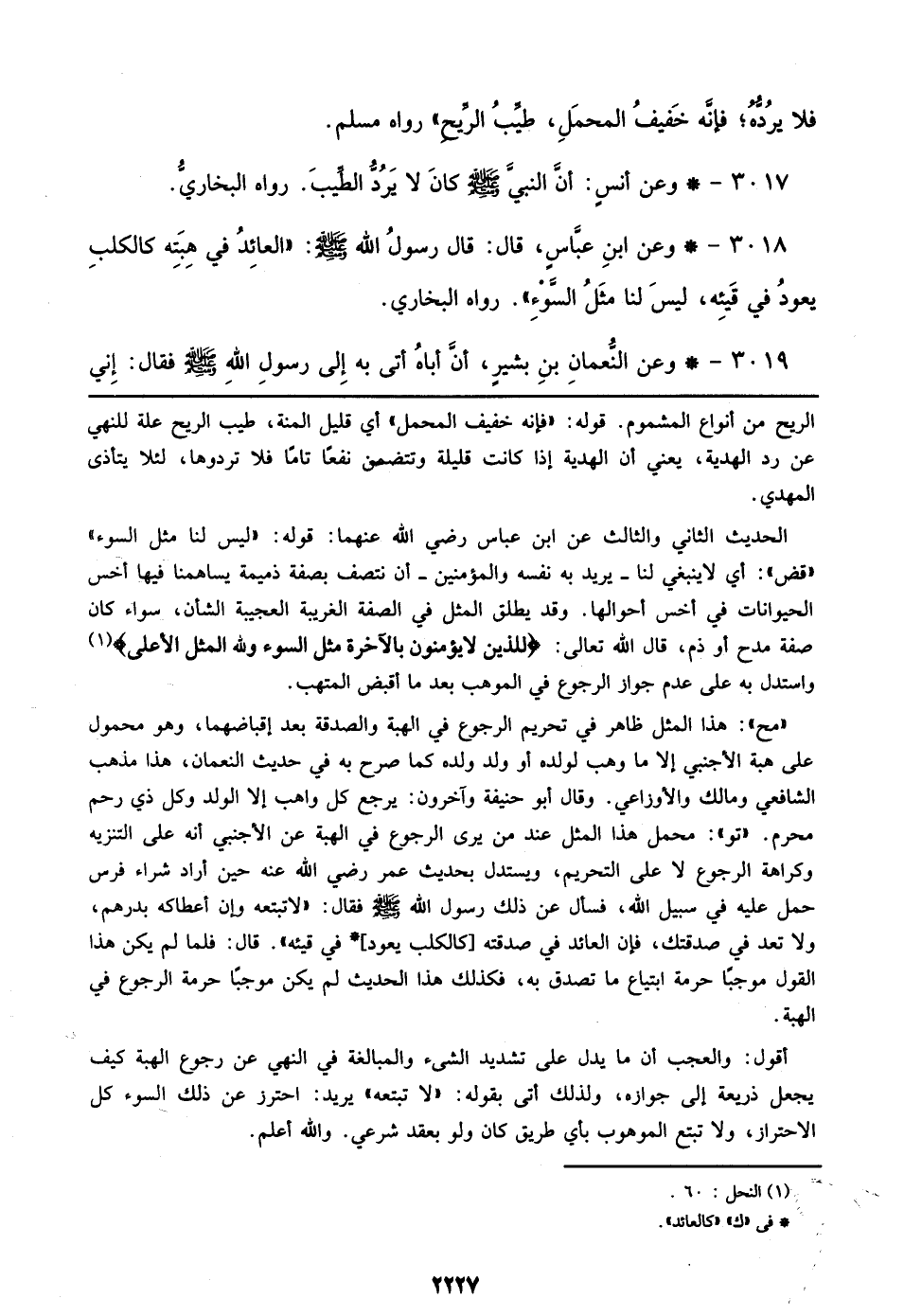الحديث الثاني والثالث عن ابن عباس رضي الله عنهما: قوله: ((ليس لنا مثل السوء)) ((قض)): أي لا ينبغي لنا – يريد به نفسه والمؤمنين – أن نتصف بصفة ذميمة يساهمنا فيها أخس الحيوانات في أخس أحوالها. وقد يطلق المثل في الصفة الغريبة العجيبة الشأن، سواء كان صفة مدح أو ذم، قال الله تعالي: {لِلَّذِينَ لا يُؤْمِنُونَ بِالآخِرَةِ مَثَلُ السَّوْءِ ولِلَّهِ المَثَلُ الأَعْلي} واستدل به علي عدم جواز الرجوع في الموهب بعد ما أقبض المتهب.