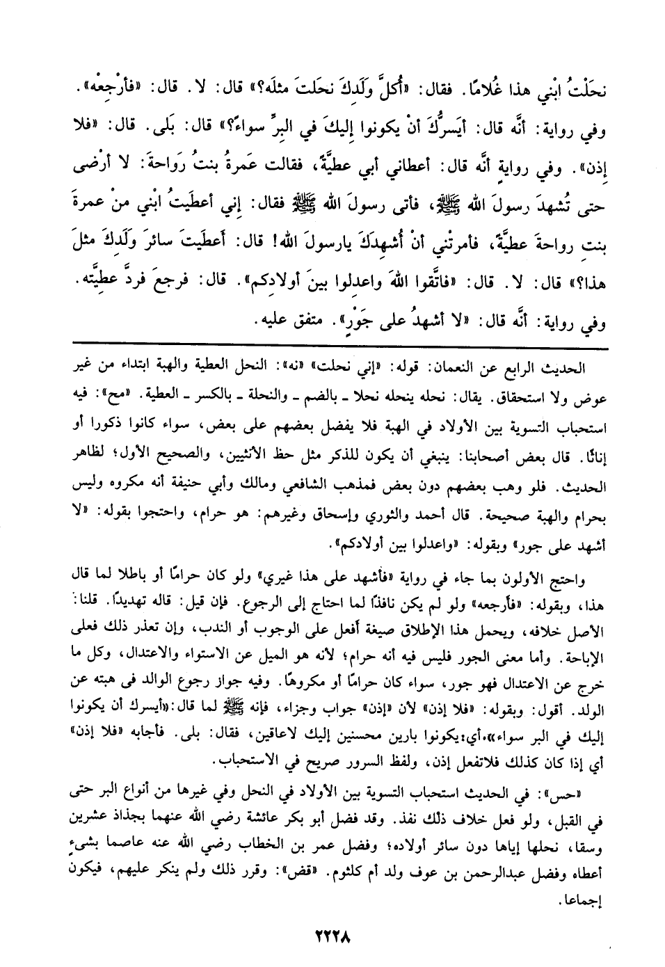نحلت ابني هذا غلاماً. فقال: ((أكل ولدك نحلت مثله؟)) قال: لا. قال: ((فأرجعه)). وفي رواية: أنه قال: أيسرك أن يكونوا إليك في البر سواء؟)) قال: بلي. قال: ((فلا إذن)). وفي رواية أنه قال: أعطإني أبي عطية، فقالت عمرة بنت رواحة: لا أرضي حتى تشهد رسول الله صلى الله عليه وسلم، فأتى رسول الله صلى الله عليه وسلم فقال: إني أعطيت ابني من عمرة بنت رواحة عطية، فأمرتني أن أشهدك يا رسول الله! قال: أعطيت سائر ولدك مثل هذا؟)) قال: لا. قال: ((فاتقوا الله واعدلوا بين أولادكم)). قال: فرجع فرد عطيته. وفي رواية: أنه قال: ((لا أشهد علي جور)). متفق عليه.