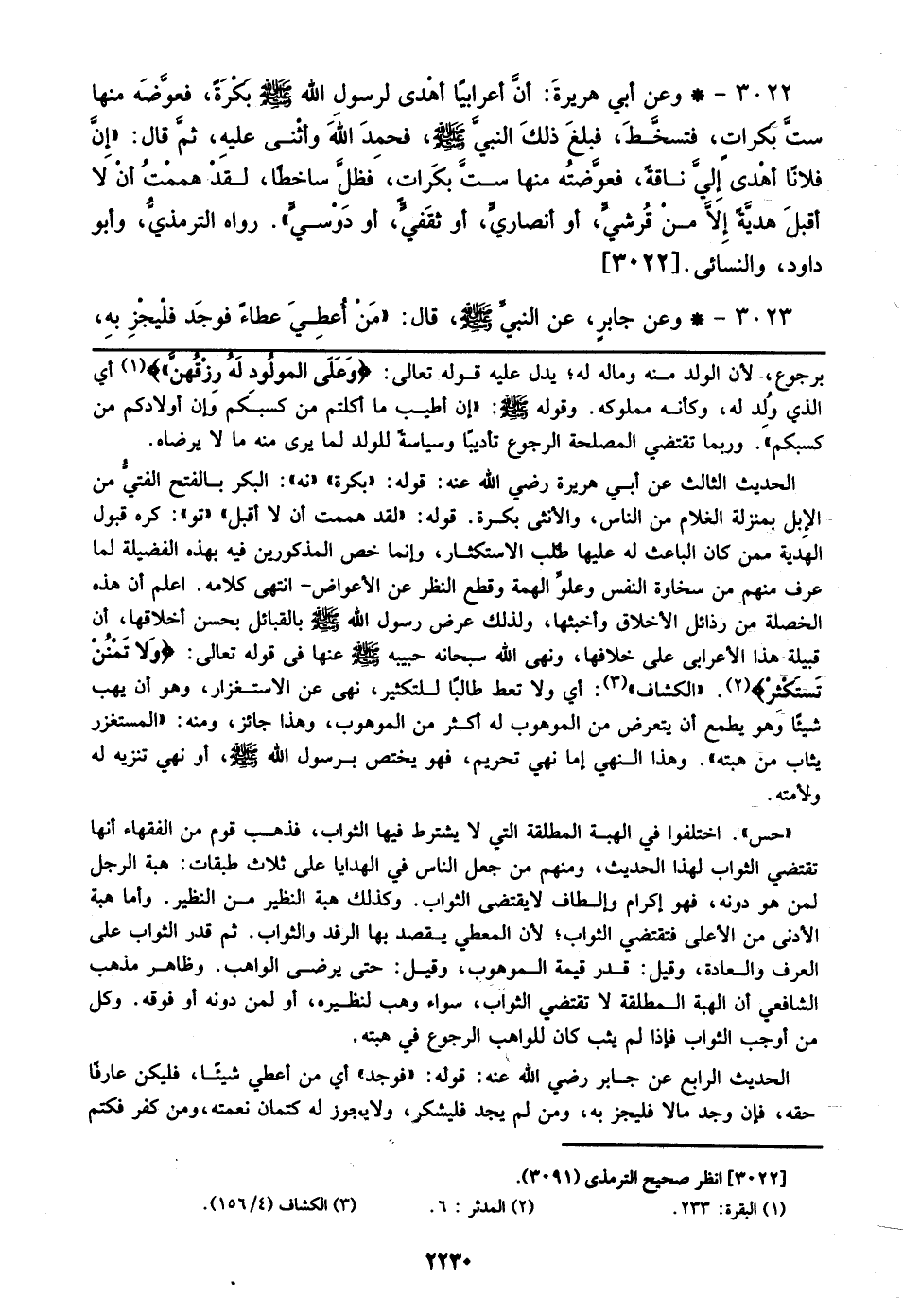 الحديث الثالث عن أبي هريرة رضي الله عنه: قوله: ((بكرة)) ((نه)): البكر بالفتح الفتي من الإبل بمنزلة الغلام من الناس، والأنثى بكرة. قوله: ((لقد هممت أن لا أقبل)) ((تو)): كره قبول الهدية ممن كان الباعث له عليها طلب الاستكثار، وإنما خص المذكورين فيه بهذه الفضيلة لما عرف منهم من سخاوة النفس وعلو الهمة وقطع النظر عن الأعواض – انتهي كلامه. اعلم أن هذه الخصلة من رذائل الأخلاق وأخبثها، ولذلك عرض رسول الله صلى الله عليه وسلم بالقبائل بحسن أخلاقها، أن قبيلة هذا الأعرابي علي خلافها، ونهي الله سبحانه حبيبه صلى الله عليه وسلم عنها في قوله تعالي: {ولا تَمْنُن تَسْتَكْثِرُ}. ((الكشاف)): أي ولا تعط طالباً للتكثير، نهي عن الاستغزار، وهو أن يهب شيئاً وهو يطمع أن يتعرض من الموهوب له أكثر من الموهوب، وهذا جائز، ومنه: ((المستغزر يثاب من هبته)). وهذا النهي إما نهي تحريم، فهو يختص برسول الله صلى الله عليه وسلم، أو نهي تنزيه له ولأمته.