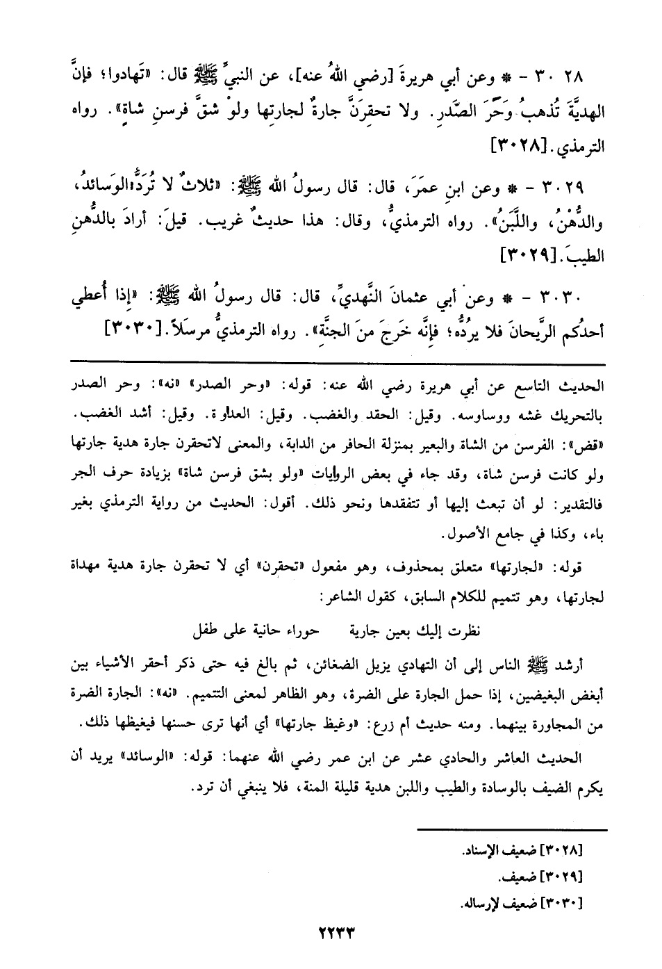 3028 - وعن أبي هريرة [رضي الله عنه]، عن النبي صلى الله عليه وسلم قال: ((تهادوا؛ فإن الهدية تذهب وحر الصدر. ولا تحقرن جارة لجارتها ولو شق فرسن شاة)). رواه الترمذي. [3028]