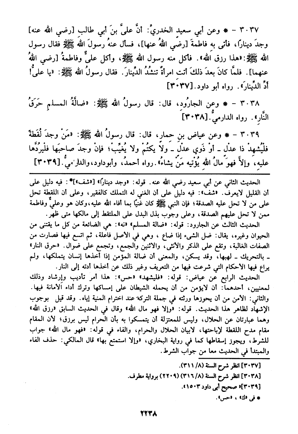 3039 - وعن عياض بن حمار، قال: قال رسول الله صلى الله عليه وسلم: ((من وجد لقطة فليشهد ذا عدل- أو ذي عدل – ولا يكتم ولا يغيب؛ فإن وجد صاحبها فليردها عليه، وإلا فهو مال الله يؤتيه من يشاء)). رواه أحمد، وأبو داود، والدارمي. [3039]