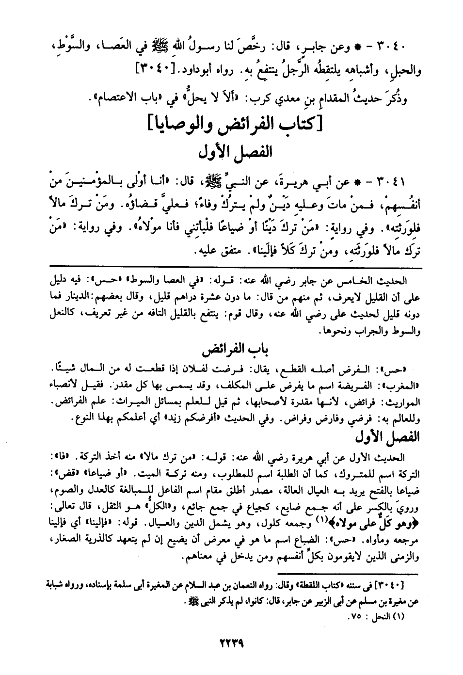 3041 - عن أبي هريرة، عن النبي صلى الله عليه وسلم، قال: ((أنا أولي بالمؤمنين من أنفسهم، فمن مات وعليه دين ولم يترك وفاء؛ فعلي قضاؤه. ومن ترك مالاً فلورثته)). وفي رواية: ((من ترك ديناً أو ضياعاً فليأتني فأنا مولاه)). وفي رواية: ((من ترك مالا فلورثته، ومن ترك كلاً فإلينا)). متفق عليه.