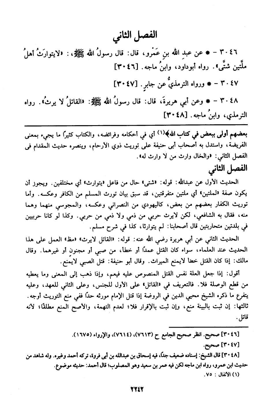 3046 - عن عبد الله بن عمرو، قال: قال رسول الله صلى الله عليه وسلم،: ((لا يتوارث أهل ملتين شتى)). رواه أبو داود، وابن ماجه. [3046]