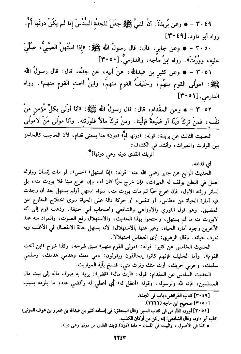3049 - وعن بريدة: أن النبي صلى الله عليه وسلم جعل للجدة السدس إذا لم يكن دونها أم. رواه أبو داود. [3049]