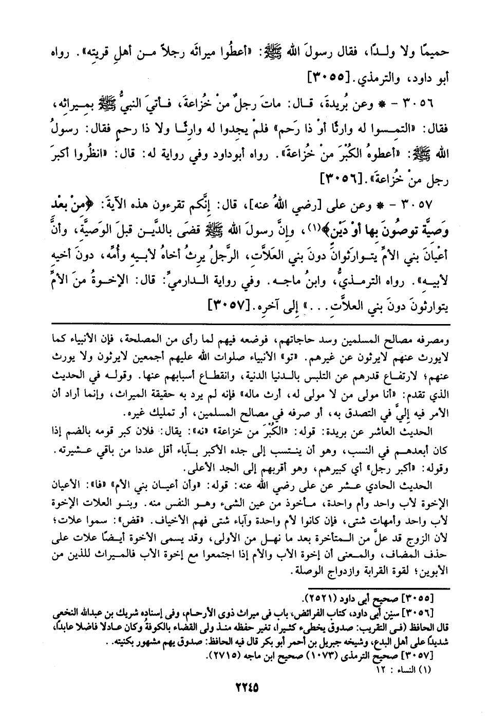 3057 - وعن علي [رضي الله عنه]، قال: إنكم تقرءون هذه الآية: {مِّنْ بَعْدِ وصِيَّةٍ تُوصُونَ بِهَا أَوْ دَيْنٍ}، وإن رسول الله صلى الله عليه وسلم قضى بالدين قبل الوصية، وأن أعيان بني الأم يتوارثوان دون بني العلات، الرجل يرث أخاه لأبيه وأمه، دون أخيه لأبيه)). رواه الترمذي، وابن ماجه. وفي رواية الدرامي: قال: الإخوة من الأم يتوارثون دون بني العلات ...)) إلي آخره. [3057]