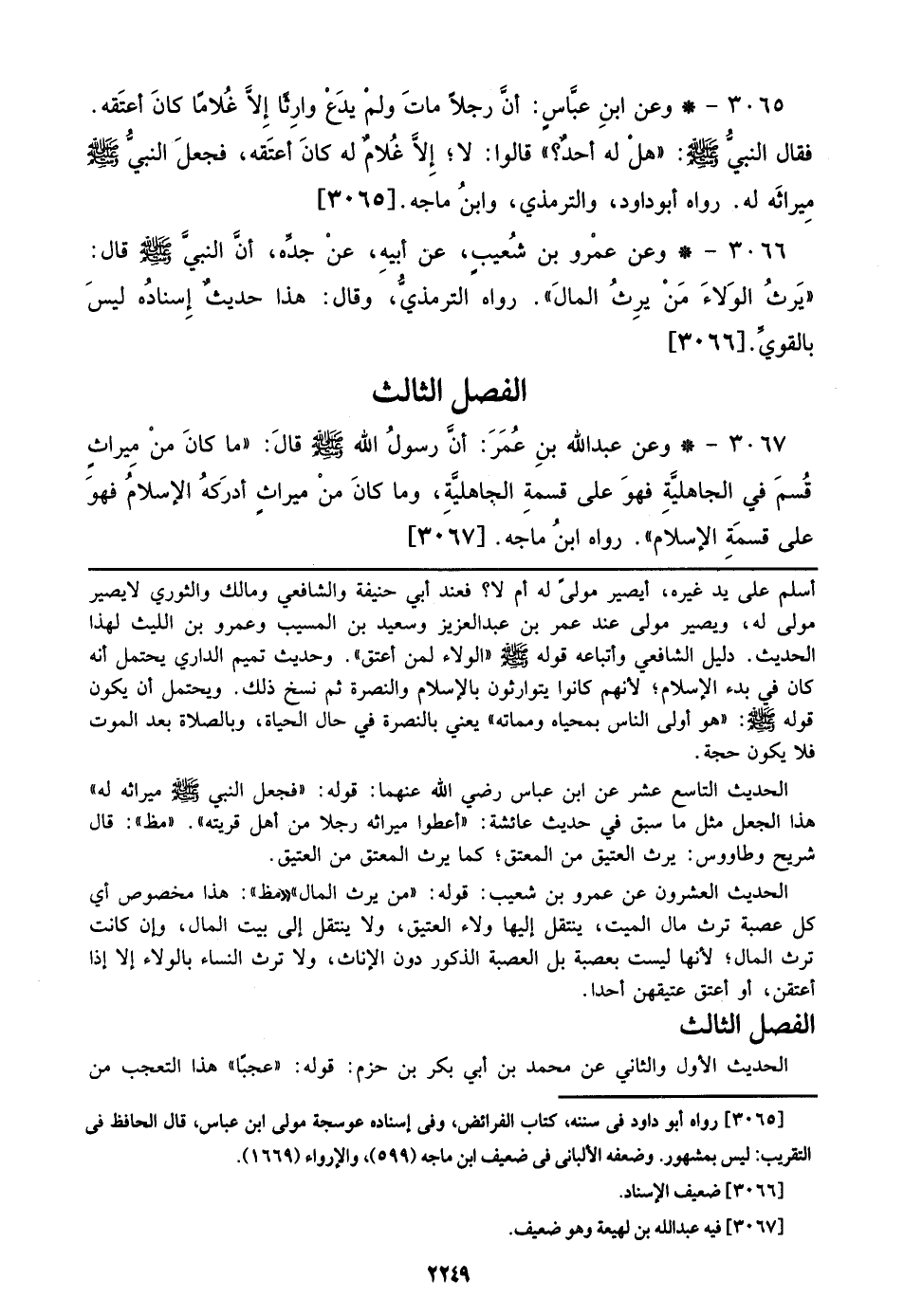 3065 - وعن ابن عباس: أن رجلاً مات ولم يدع وارثاً إلا غلاماً كان أعتقه. فقال النبي صلى الله عليه وسلم: ((هل له أحد؟)) قالوا: لا؛ إلا غلام له كان أعتقه، فجعل النبي صلى الله عليه وسلم ميراثه له. رواه أبو داود، والترمذي، وابن ماجه. [3065]