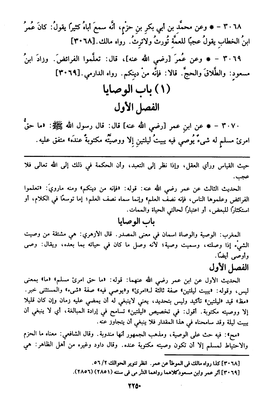 3070 - عن ابن عمر [رضي الله عنه] قال: قال رسول الله صلى الله عليه وسلم: ((ما حق امرئ مسلم له شيء يوصي فيه يبيت ليلتين إلا ووصيته مكتوبة عنده)) متفق عليه.