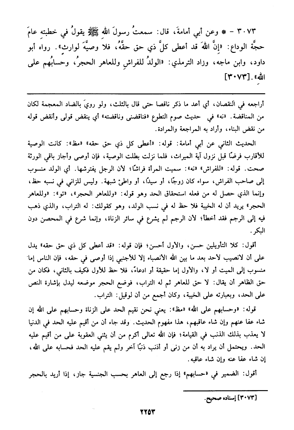 3073 - وعن أبي أمامة، قال: سمعت رسول الله صلى الله عليه وسلم يقول في خطبته عام حجة الوداع: ((إن الله قد أعطى كل ذي حق حقه، فلا وصية لوارث)). رواه أبو داود، وابن ماجه، وزاد الترمذي: ((الولد للفراش والعاهر الحجر، وحسابهم علي الله)). [3073]