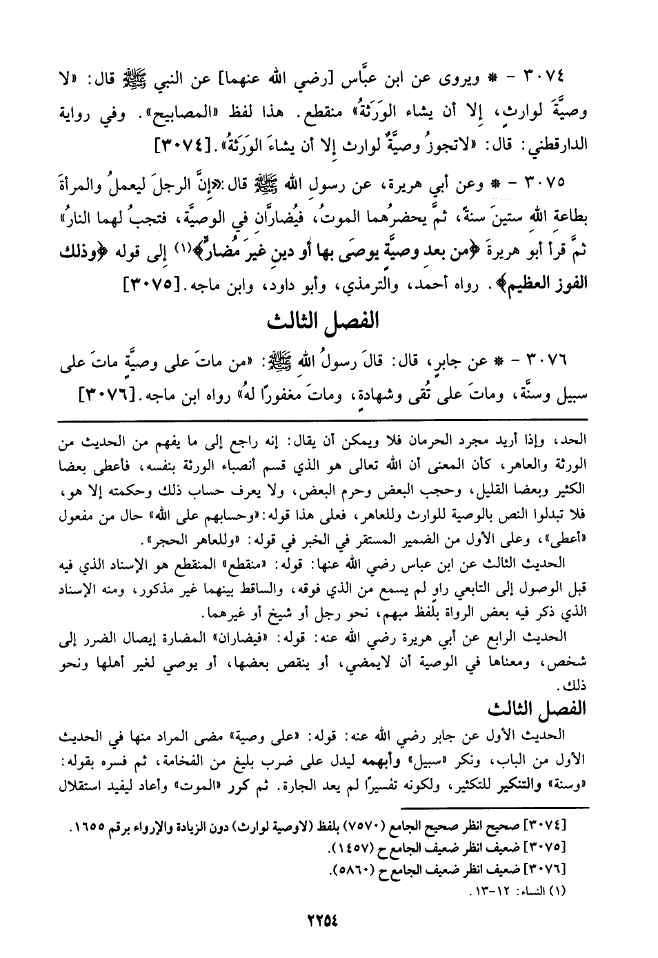 3074 – * ويروى عن ابن عباس [رضي الله عنهما] عن النبي صلى الله عليه وسلم قال: ((لا وصية لوارث، إلا أن يشاء الورثة)) منقطع. هذا لفظ ((المصابيح)). وفي رواية الدارقطني: قال: ((لا تجوز وصية لوارث إلا أن يشاء الورثة)). [3074]