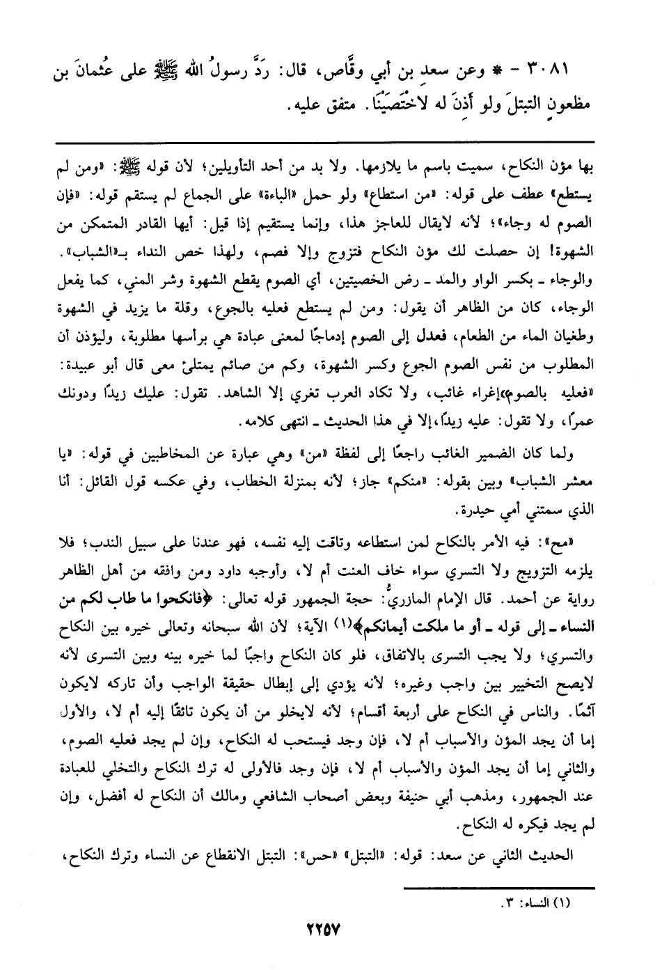 3081 - وعن سعد بن أبي وقاص، قال: رد رسول الله صلى الله عليه وسلم علي عثمان بن معظون التبتل ولو أذن له لاختصينا. متفق عليه.