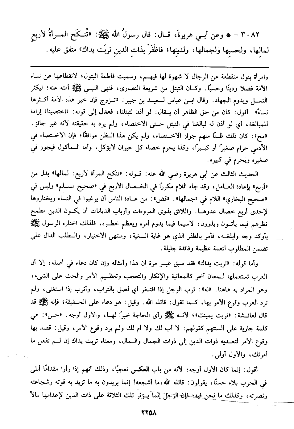 3082 - وعن أبي هريرة، قال: قال رسول الله صلى الله عليه وسلم: ((تنكح المرأة لأربع لمالها، ولحسبها ولجمالها، ولدينها؛ فاظفر بذات الدين تربت يداك)) متفق عليه.