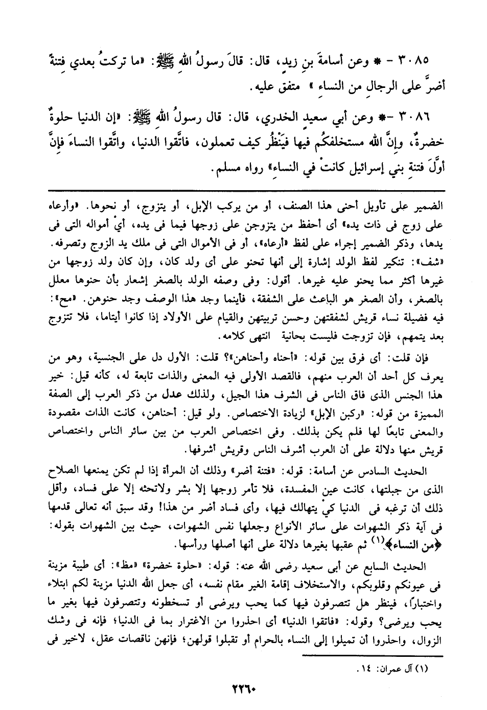 3085 - وعن أسامة بن زيد، قال: قال رسول الله صلى الله عليه وسلم: ((ما تركت بعدي فتنة أضر علي الرجال من النساء)) متفق عليه.