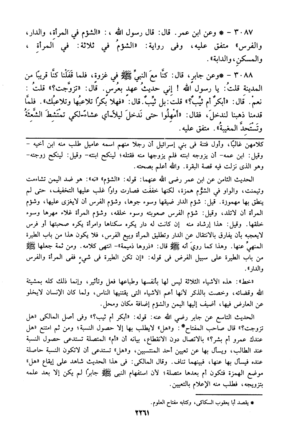 3087 - وعن ابن عمر. قال: قال رسول الله،: ((الشؤم في المرأة، والدار، والفرس)) متفق عليه، وفي رواية: ((الشؤم في ثلاثة: في المرأة، والمسكن، والدابة)).