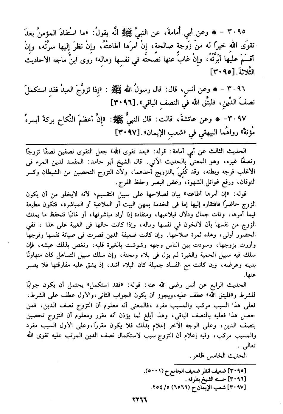 3096 - وعن أنس، قال: قال رسول الله صلى الله عليه وسلم: ((إذا تزوج العبد فقد استكمل نصف الدين، فليتق الله في النصف الباقي)). [3096]