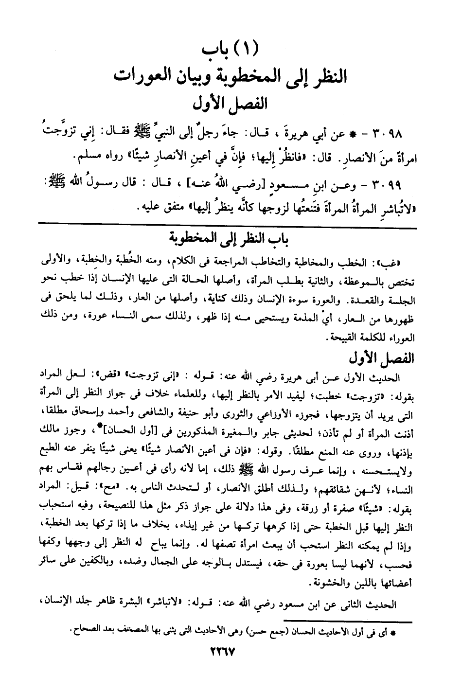 الحديث الأول عن أبي هريرة رضي الله عنه: قوله: ((إني تزوجت)) ((قض)): لعل المراد بقوله: ((تزوجت)) خطبت؛ ليفيد الأمر بالنظر إليها، وللعلماء خلاف في جواز النظر إلي المرأة التي يريد أن يتزوجها، فجوزه الأوزاعي والثوري وأبو حنيفة والشافعي وأحمد وإسحاق مطلقا، أذنت المرأة أو لم تأذن؛ لحديث جابر والمغيرة المذكورين في [أول الحسان] *، وجوز مالك بإذنها، وروى عنه المنع مطلقا. وقوله: ((فإن في أعين الأنصار شيئا)) يعني شيئا ينفر عنه الطبع ولا يستحسنه، وإنما عرف رسول الله صلى الله عليه وسلم ذلك، إما لأنه رأي في أعين رجالهم فقاس بهم النساء؛ لأنهن شقائقهم؛ ولذلك أطلق الأنصار، أو لتحدث الناس به. ((مح)): قيل: المراد بقوله: ((شيئا)) صفرة أو زرقة، وفي هذا دلالة علي جواز ذكر مثل هذا للنصيحة، وفيه استحباب النظر إليها قبل الخطبة حتى إذا كرهها تركها من غير إيذاء، بخلاف ما إذا تركها بعد الخطبة، وإذا لم يمكنه النظر استحب أن يبعث امرأة تصفها له. وإنما يباح له النظر إلي وجهها وكفها فحسب، لأنهما ليسا بعورة في حقه، فيستدل بالوجه علي الجمال وضده، وبالكفين علي سائر أعضائها باللين والخشونة.
