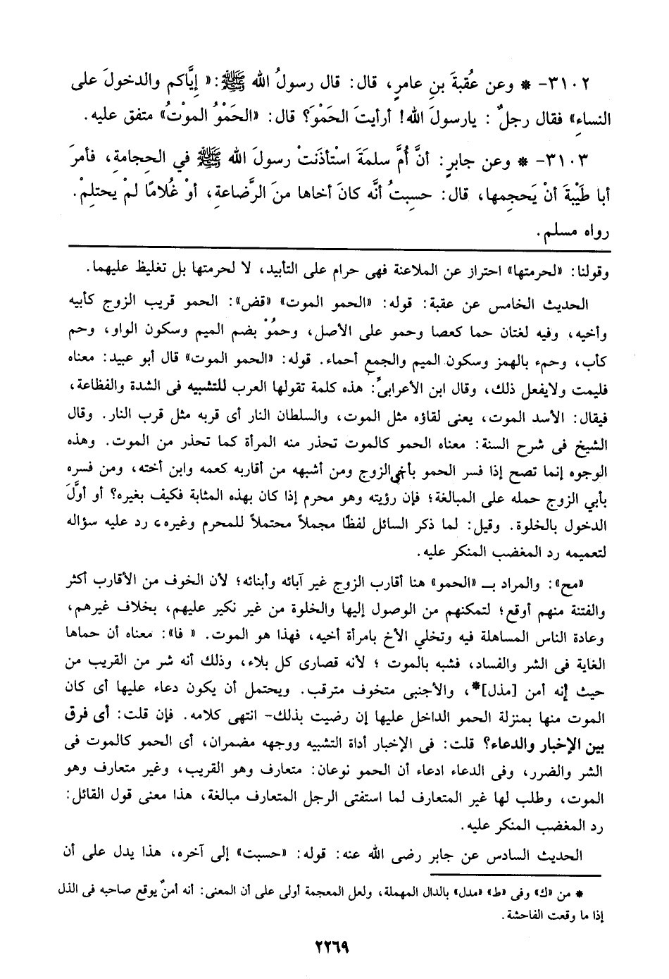 3102 - وعن عقبة بن عامر، قال: قال رسول الله صلى الله عليه وسلم: ((إياكم والدخول علي النساء)) فقال رجل: يا رسول الله! أرأيت الحمو؟ قال: ((الحمو الموت)) متفق عليه.