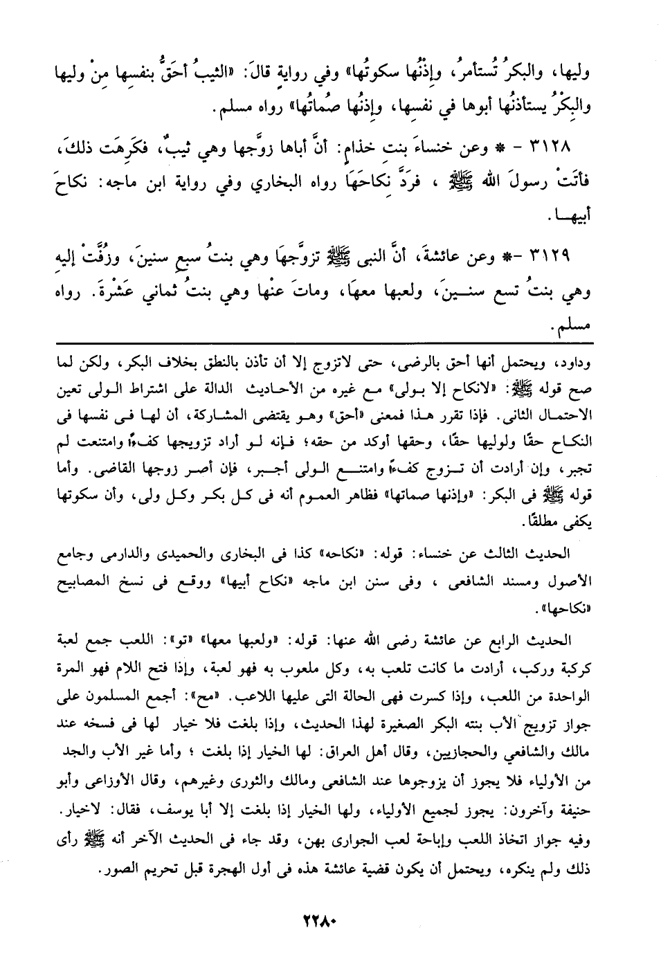 3128 – * وعن خنساء بنت خذام: أن أباها زوجها وهي ثيب، فكرهت ذلك، فأتت رسول الله صلى الله عليه وسلم، فرد نكاحها رواه البخاري وفي رواية ابن ماجة: نكاح أبيها