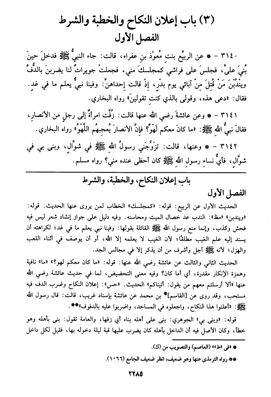 الحديث الثاني والثالث عن عائشة رضي الله عنها: قاوله: ((ما كان معكم لهو؟)) ((ما)) نافية وهمزة الإنكار مقدرة، أي أما كان؟ وفيه معنى التخصيص، لما في حديث عائشة رضي الله عنها ((ألا أرسلتم معهم من يقول: أتيناكم)) الحديث. ((حس)): إعلان النكاح وضرب الدف فيه مستحب، وقد روي عن [القاسم] * بن محمد عن عائشة بإسناد غريب، قالت: قال رسول الله صلى الله عليه وسلم: ((أعلنوا هذا النكاح، واجعلوه في المسجد، واضربوا عليه بالدفوف)) **.
