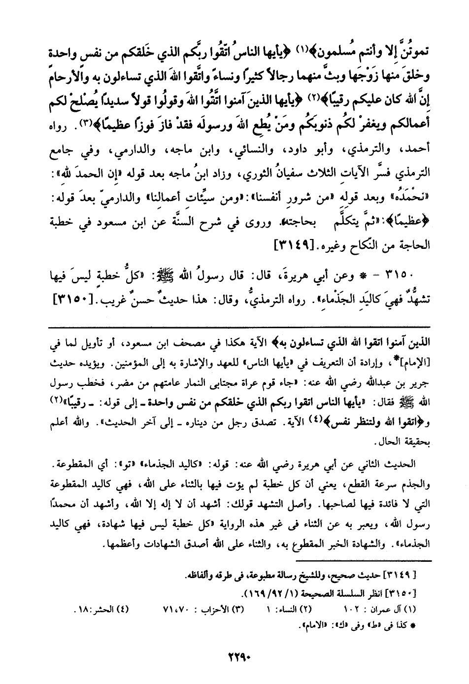 تَمُوتُنَّ إلاَّ وأَنتُم مُّسْلِمُونَ} {يَا أَيُّهَا النَّاسُ اتَّقُوا رَبَّكُمُ الَّذِي خَلَقَكُم مِّن نَّفْسٍ واحِدَةٍ وخَلَقَ مِنْهَا زَوْجَهَا وبَثَّ مِنْهُمَا رِجَالاً كَثِيرًا ونِسَاءً واتَّقُوا اللَّهَ الَّذِي تَسَاءَلُونَ بِهِ والأَرْحَامَ إنَّ اللَّهَ كَانَ عَلَيْكُمْ رَقِيبًا} {يَا أَيُّهَا الَّذِينَ آمَنُوا اتَّقُوا اللَّهَ وقُولُوا قَوْلاً سَدِيدًا (70) يُصْلِحْ لَكُمْ أَعْمَالَكُمْ ويَغْفِرْ لَكُمْ ذُنُوبَكُمْ ومَن يُطِعِ اللَّهَ ورَسُولَهُ فَقَدْ فَازَ فَوْزًا عَظِيمًا}. رواه أحمد، والترمذي، وأبو داوود، والنسائي، وابن ماجة، والدارمي، وفي جامع الترمذي فسر الآيات الثلاث سفيان الثوري، وزاد ابن ماجه بعد قوله ((إن الحمد لله)): ((نحمده)) وبعد قوله ((من شرور أنفسنا)): ((ومن سيئات أعمالنا)) والدارمي بعد قوله: {عَظِيمًا}: ((ثم يتكلم بحاجته)). وروى في شرح السنة عن ابن مسعود في خطبة الحاجة من النكاح وغيره. [3149]