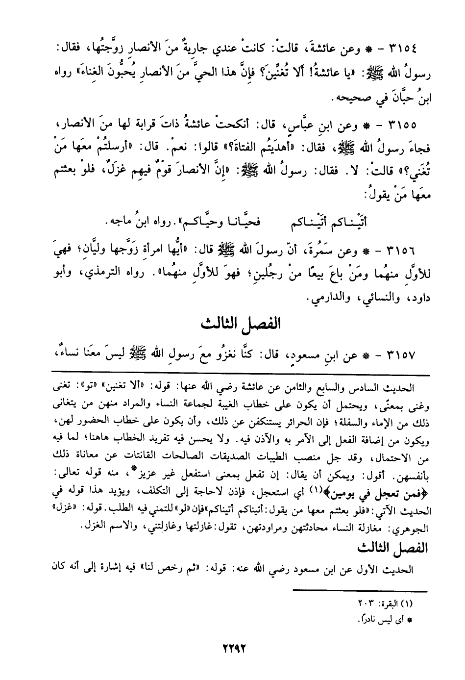3155 - وعن ابن عباس، قال: أنكحت عائشة ذات قرابة لها من الأنصار، فجاء رسول الله صلى الله عليه وسلم، فقال: ((أهديتم الفتاة؟)) قالوا: نعم. قال: ((أرسلتم معها من تغني؟)) قالت: لا. فقال: رسول الله صلى الله عليه وسلم: ((إن الأنصار قوم فيهم غزل، فلو بعثتم معها من يقول: