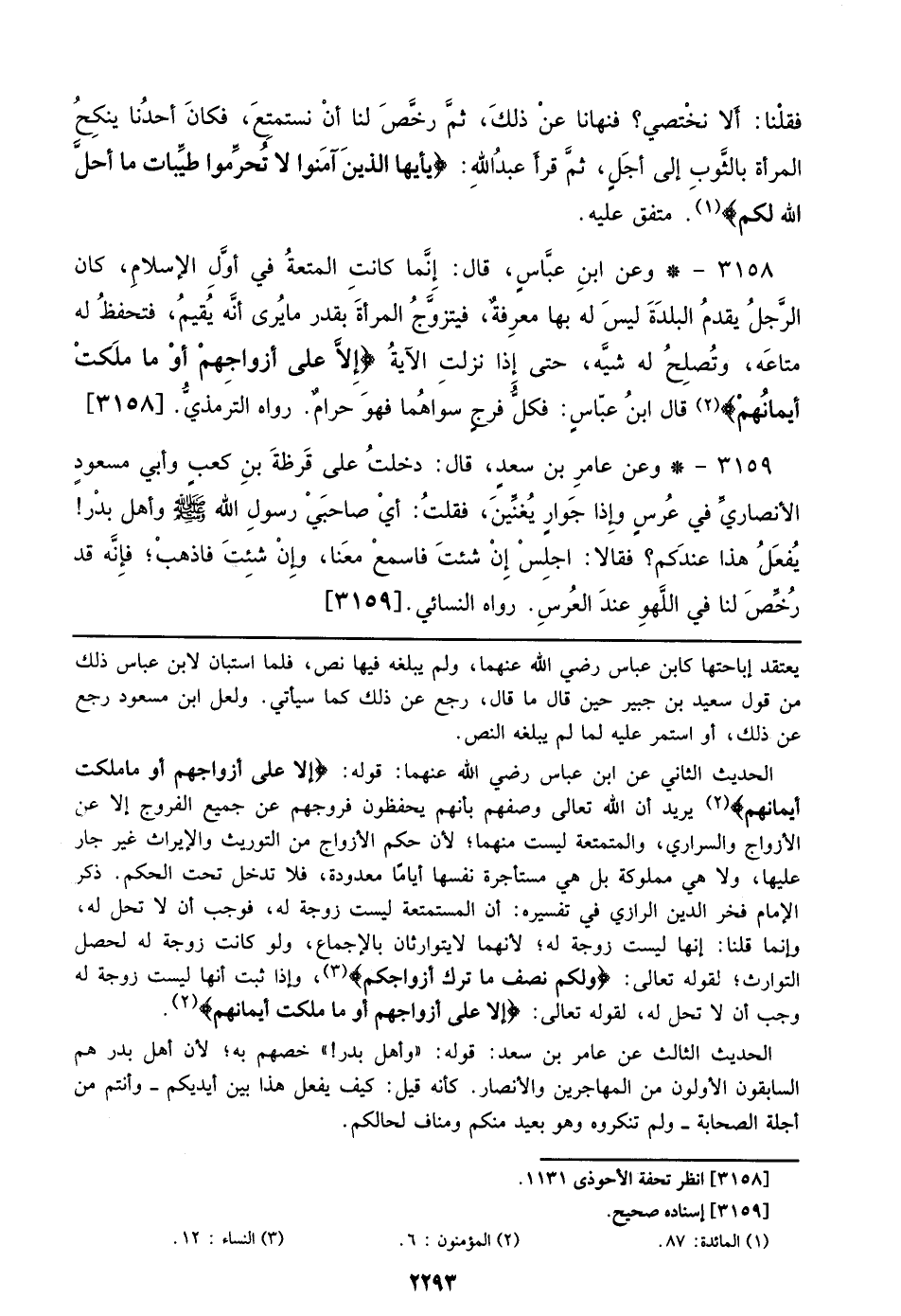 3158 - وعن ابن عباس، قال: إنما كانت المتعة في أول الإسلام، كان الرجل يقدم البلدة ليس له بها معرفة، فيتزوج المرأة بقدر ما يرى أنه يقيم، فتحفظ له متاعه، وتصلح له شيه، حتى إذا نزلت الآية {إلاَّ عَلي أَزْوَاجِهِمْ أَوْ مَا مَلَكَتْ أَيْمَانُهُمْ} قال ابن عباس: فكل فرج سواهما فهو حرام. رواه الترمذي. [3158]