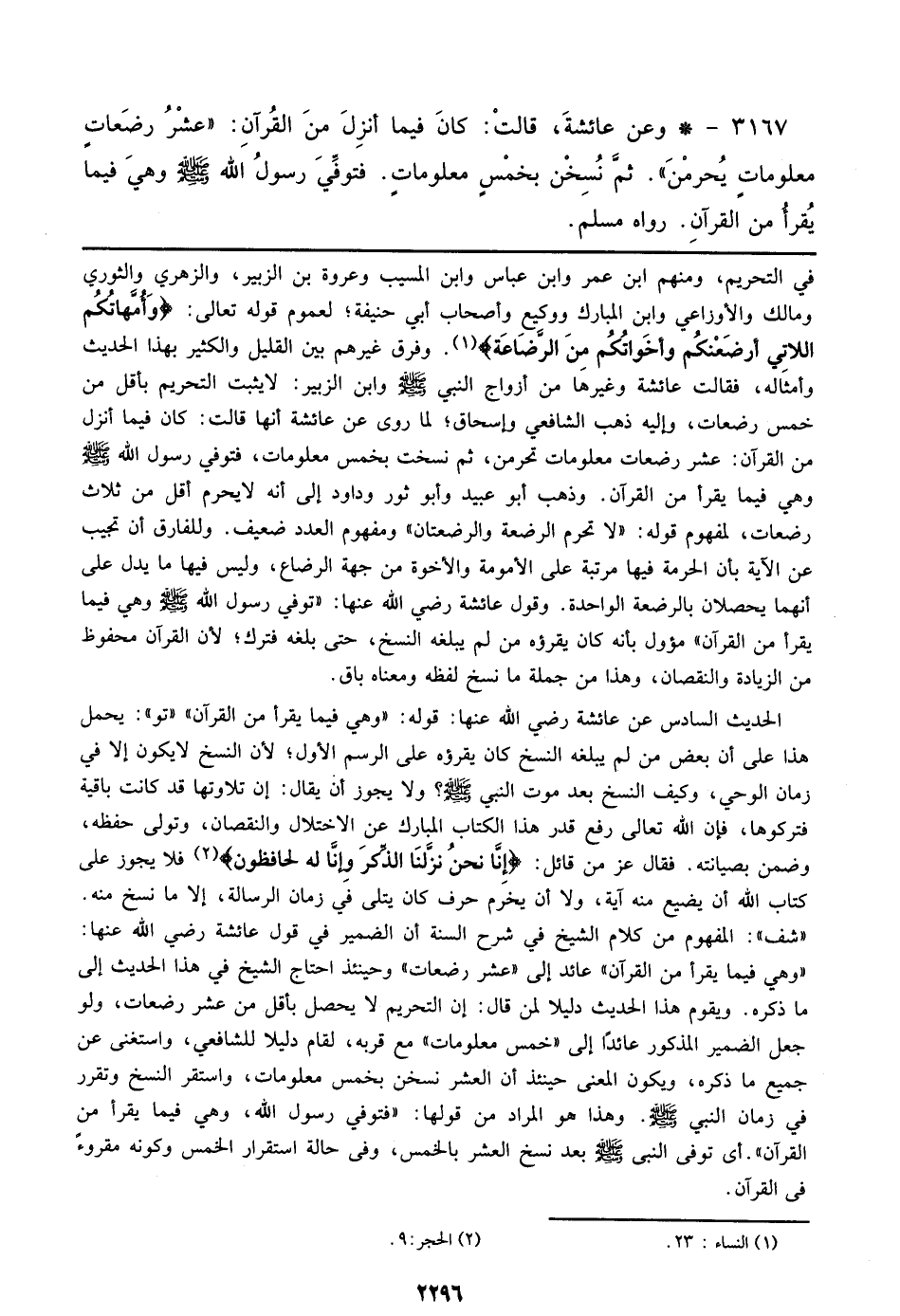 3167 - وعن عائشة، قالت: كان فيما أنزل من القرآن: ((عشر رضعات معلومات يحرمن)). ثم نسخن بخمس معلومات. فتوفي رسول الله صلى الله عليه وسلم وهي فيما يقرأ من القرآن. رواه مسلم.