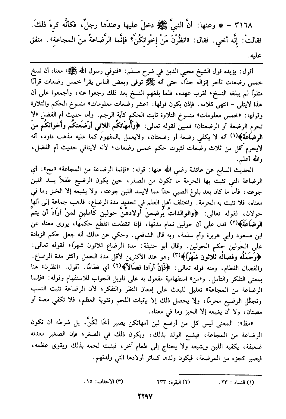 الحديث السابع عن عائشة رضي الله عنها: قوله: ((فإنما الرضاعة من المجامعة)) ((مح)): أي الرضاعة التي تثبت بها الحرمة ما تكون من الصغر، حين يكون الرضيع طفلا يسد اللبن جوعته، فأما ما كان بعد بلوغ الصبي حدا مما لا يسد اللبن جوعته، ولا يشبعه إلا الخبز وما في معناه، فلا تثبت به الحرمة. واختلف أهل العلم في تحديد مدة الرضاع، فذهب جماعة إلي أنها حولان، لقوله تعالي: {والْوَالِدَاتُ يُرْضِعْنَ أَوْلادَهُنَّ حَوْلَيْنِ كَامِلَيْنِ لِمَنْ أَرَادَ أَن يُتِمَّ الرَّضَاعَة} فدل علي أن حولين تمام مدتها، فإذا انقطعت انقطع حكمها، يروى معناه عن ابن مسعود وأبي هريرة وأم سلمه، وبه قال الشافعي. وحكي عن مالك أنه جعل حكم الزيادة علي الحولين حكم الحولين. قال أبو حنيفة: مدة الرضاع ثلاثون شهرا؛ لقوله تعالي: {وحَمْلُهُ وفِصَالُهُ ثَلاثُونَ شَهْرًا} وهو عند الأكثرين لأقل مدة الحمل وأكثر مدة الرضاع. والفصال الفطام، ومنه قوله تعالي: {فَإنْ أَرَادَا فِصَالاً} أي فطاما. أقول: ((انظرن)) هنا بمعنى التفكر والتأمل. و ((من)) استفهامية مفعول به علي تأويل الجواب للاستفهام وقوله: ((فإنما الرضاعة من المجاعة)) تعليل للبعث علي إمعان النظر والتفكير؛ لأن الرضاعة تثبت النسب وتجعل الرضيع محرما، ولا يحصل ذلك إلا بإنبات اللحم وتقوية العظم، فلا تكفي مصة أو مصتان، ولا أن يشبعه إلا الخبز وما في معناه.