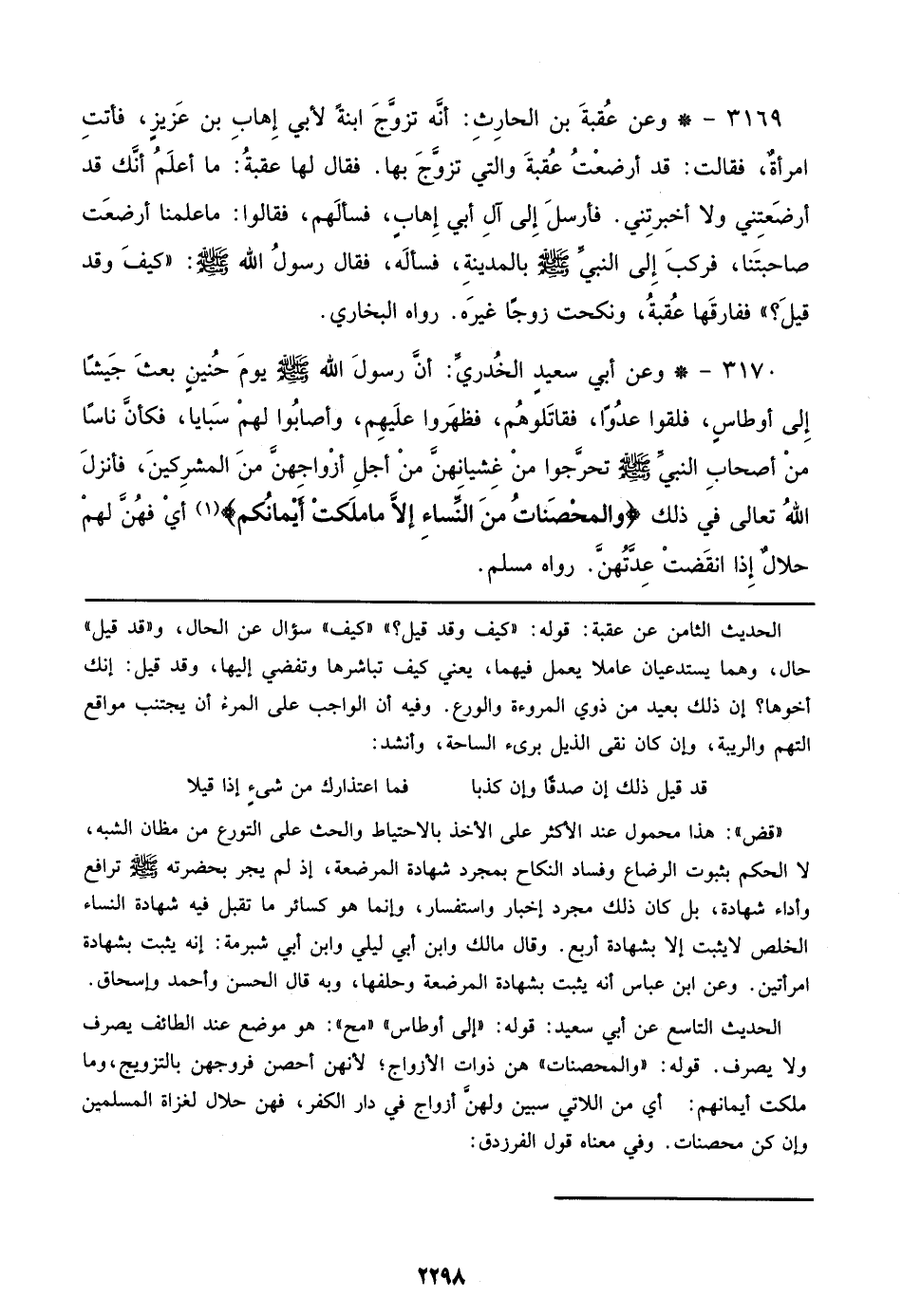 3170 - وعن أبي سعيد الخدري: أن رسول الله صلى الله عليه وسلم يوم حنين بعث جيشا إلي أوطاس، فلقوا عدوا، فقاتلوهم، فظهروا عليهم، وأصابوا لهم سبايا، فكأن ناسا من أصحاب النبي صلى الله عليه وسلم تحرجوا من غشيانهن من أجل أزواجهن من المشركين، فأنزل الله تعالي في ذلك {والْمُحْصَنَاتُ مِنَ النِّسَاءِ إلاَّ مَا مَلَكَتْ أَيْمَانُكُمْ} أي فهن لهم حلال إذا انقضت عدتهن. رواه مسلم.